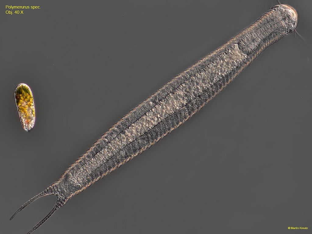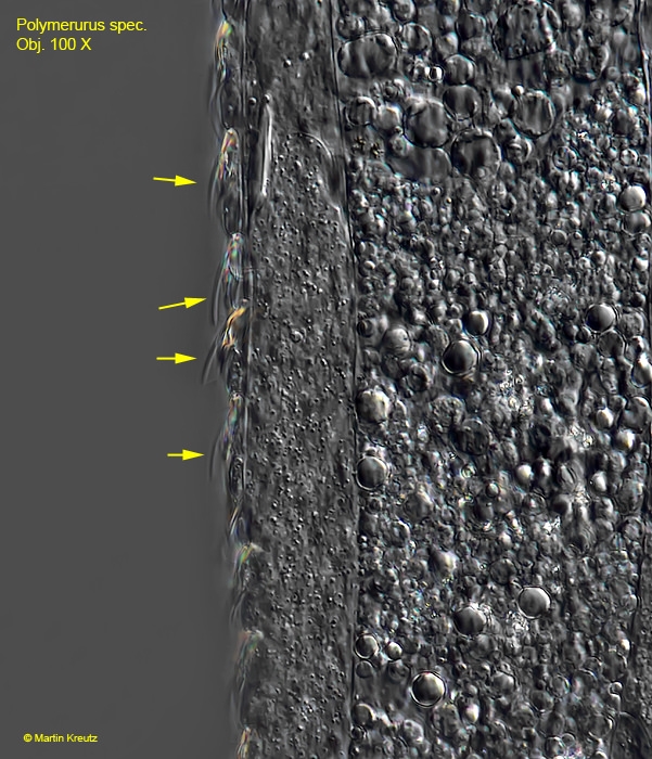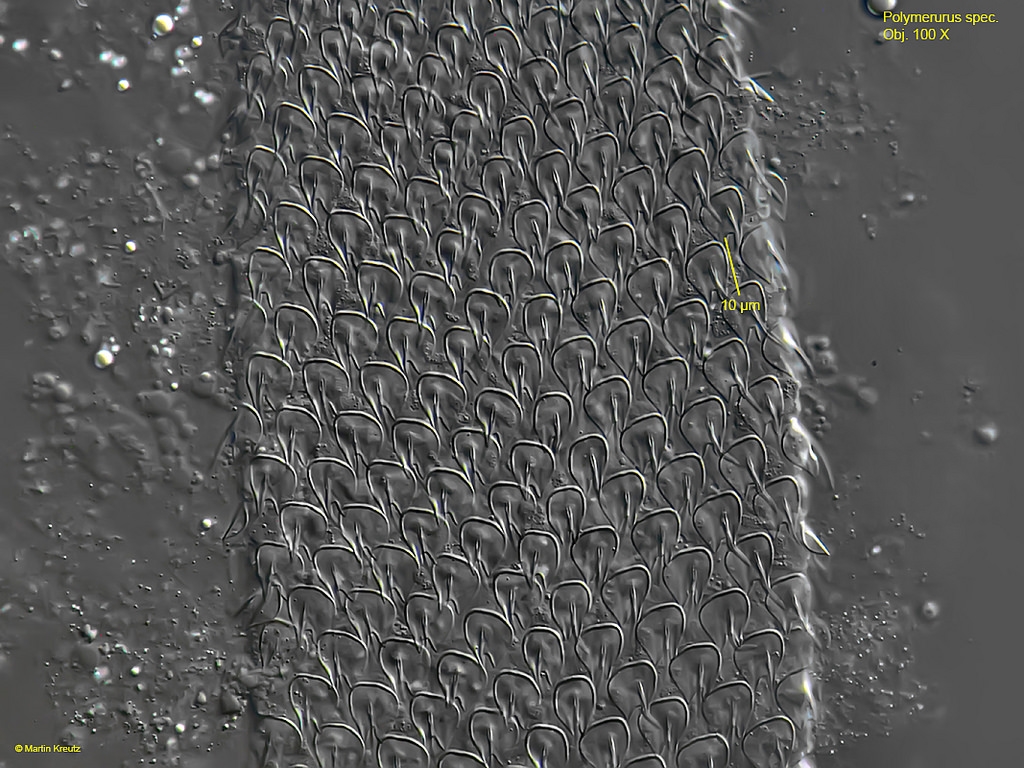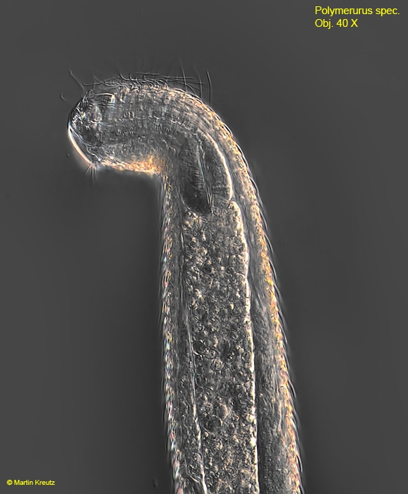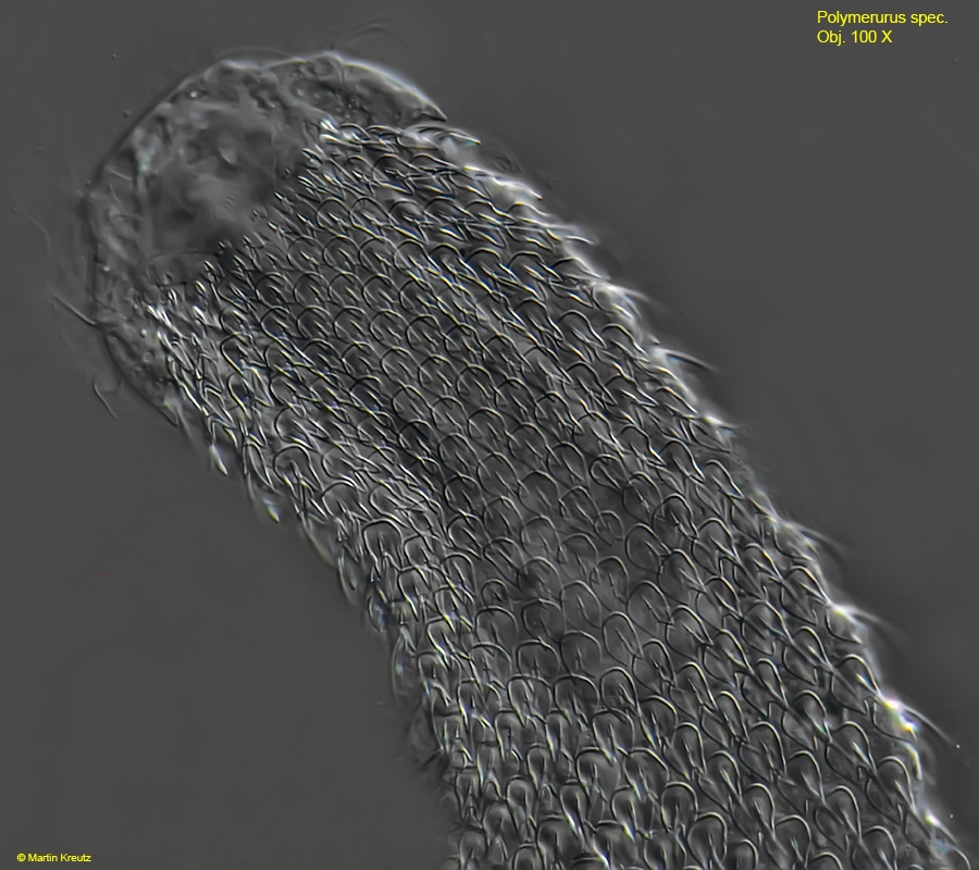 Dieser Gastrotriche ist zwischen 400 - 600 µm lang, also recht stattlich. Ein schneller Schwimmer. Sehr typisch ist das Abknicken des Kopfes, wie auf einem Bild unten gezeigt. Die Kleberöhrchen sehen denen von Polymerurus sehr ähnlich, sind aber wesentlich kürzer. Auch die Schuppen sind anders als bei Polymerurus rhomboides. Trotzdem glaube ich, hier einen Vertreter von Polymerurus vor mir zu haben. Ich bin gespannt auf Deine Meinung.