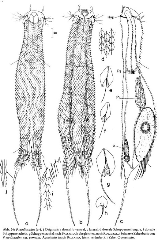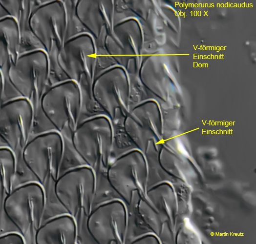 P. nodicaudus gehört mit einer Maximallänge von ca. 550µm zu den größten Gastrotrichen in Europa. Typisch sind die von Dir gezeigten Schuppen, die ich als grob sechseckig mit drei Kielen bezeichnen würde und die einen kurzen, einfachen Stachel tragen. Der von Dir angesprochene V-förmige distale Einschnitt scheint mir ein Artefakt der geringen Tiefenschärfe bei DIC zu sein. Die distalen Kanten der Gastrotrichen-Schuppen sind meist sehr zart und stehen über den nachfolgenden Schuppen, auf die man unwillkürlich scharf stellt. Diese hinteren Kanten sind dann oft nicht zu sehen (das ist einer der Gründe, warum eine Schuppenanalyse mit Ablösen der Schuppen empfohlen wird). Die Schuppen entsprechen dann der sechseckigen Variante, die lediglich im Text erwähnt wird. Abgebildet wird leider nur die fünfeckige Variante. Die fehlende "Behaarung" der Zehenbasis ist normal - im Schwank abgebildet wird nur P. nodicaudus var. comatus, die sich durch eben diese "Behaarung" von der Nominalform unterscheidet.