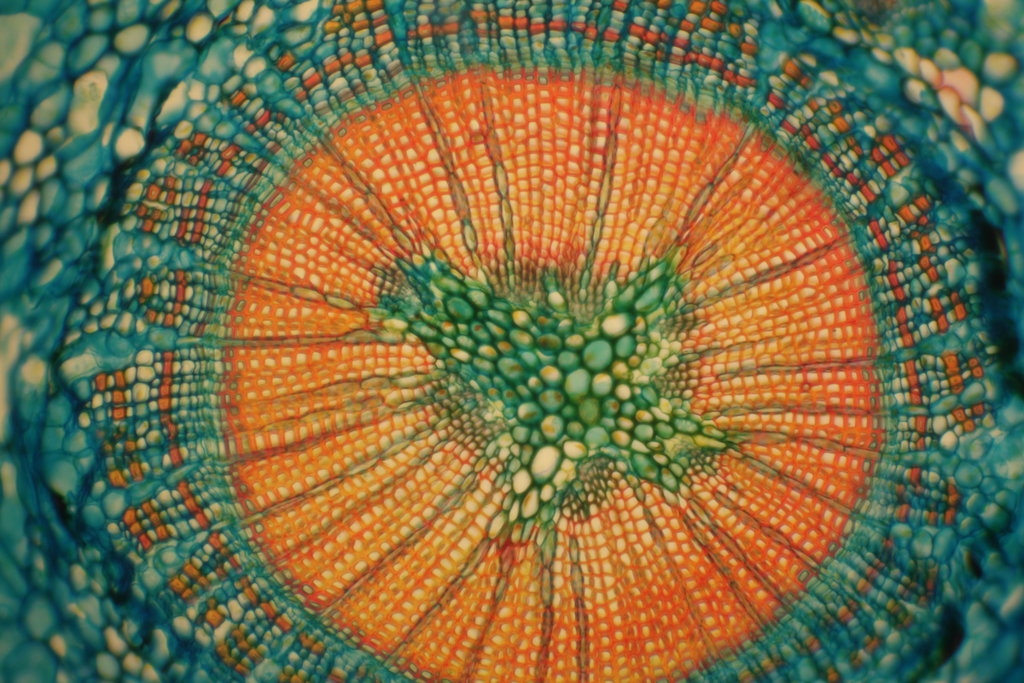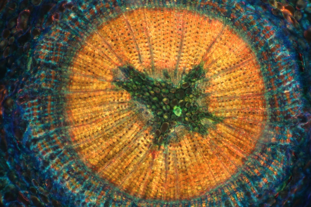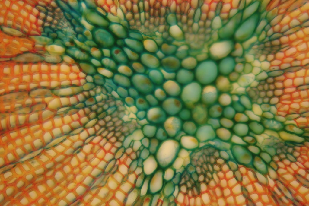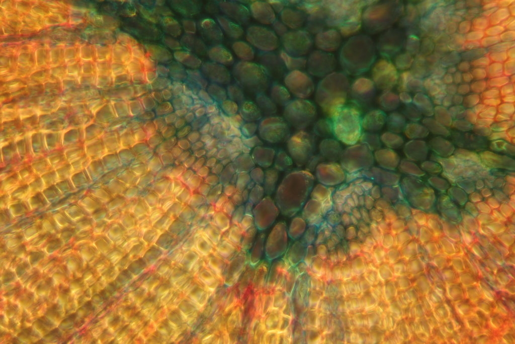 An der ,,Tandem-Optik" zwischen Canon-Kamera und Mikroskop-Objektiv kann das nicht liegen. Das Bild der Canon-Kamera über den Senkrecht-/Foto-Tubus und das Bild im Sehfeld (am Bino) waren  beim Pflanzenschnitt farblich und bezüglich der Schärfe gleich. Allerdings ist mir aufgefallen, dass es schwierig war, eine ,,knackig scharfe" Ebene des Pflanzenschnittes selbst im Zentrum des Bildes zu finden. (Die ,,Unschärfe" mag an der Dicke/Struktur des Pflanzenschnittes liegen.)