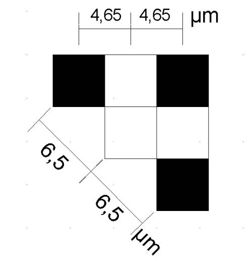 Es kommt auf das verwendete Objektiv an. Auf die Zwischenbildebene bezogen löst ein 100/1,25 zwei Punkt mit Abstand 22µm auf. Betrachtet man das nachstehende Pixelmuster, so ist auch im üngünstigsten Fall (diagonal) der Abstand von 2 Pixelabständen 13µm. Also kann die Kamera alle Informationen der Optik auch verarbeiten.