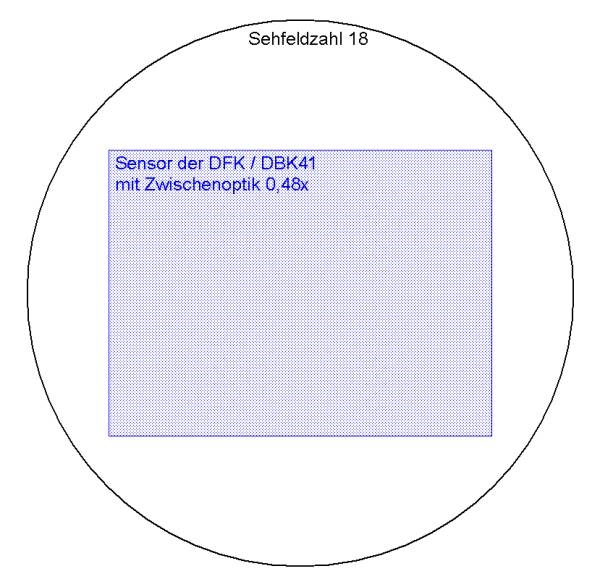 Angenommen ich habe ein 10x Okular mit einer Sehfeldzahl 18 und setze an der kleinen Kamera von ImagingSource DFK41 ein Objketiv mit f = 12mm an. So errechnet sich ein Faktor von 12 / 25 = 0,48.  Mit dieser Adaption "sieht" die Kamera das blau gezeichnete Feld.