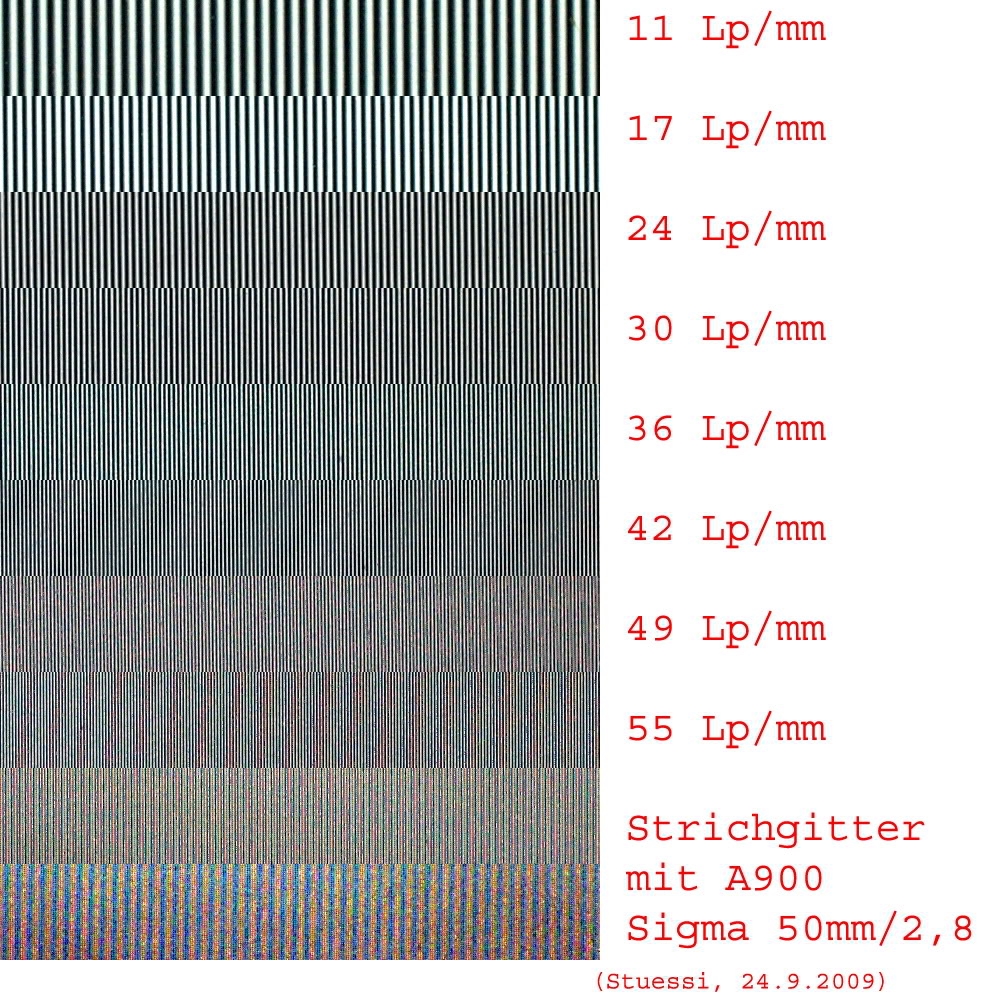 angeregt durch den Beitrag "Testgitter" von Herrn Höbel habe ich eine Vorlage erzeugt und mit einer Alpha 900 aus verschiedenen Abständen fotografiert, um die Grenze der Auflösung des Kamerasensors zu bestimmen. Alle Bilder wurden mehrfach aufgenommen und das jeweils beste zum Vergleich ausgewählt. Stativ, Blitz und lotrechte Ausrichtung mit Spiegel waren selbstverständlich.
