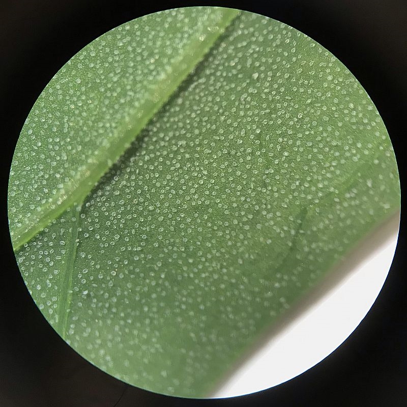 Bild 6: Ein Blick durch die Lube zeigt die Blasenhaare auf der Blattunterseite