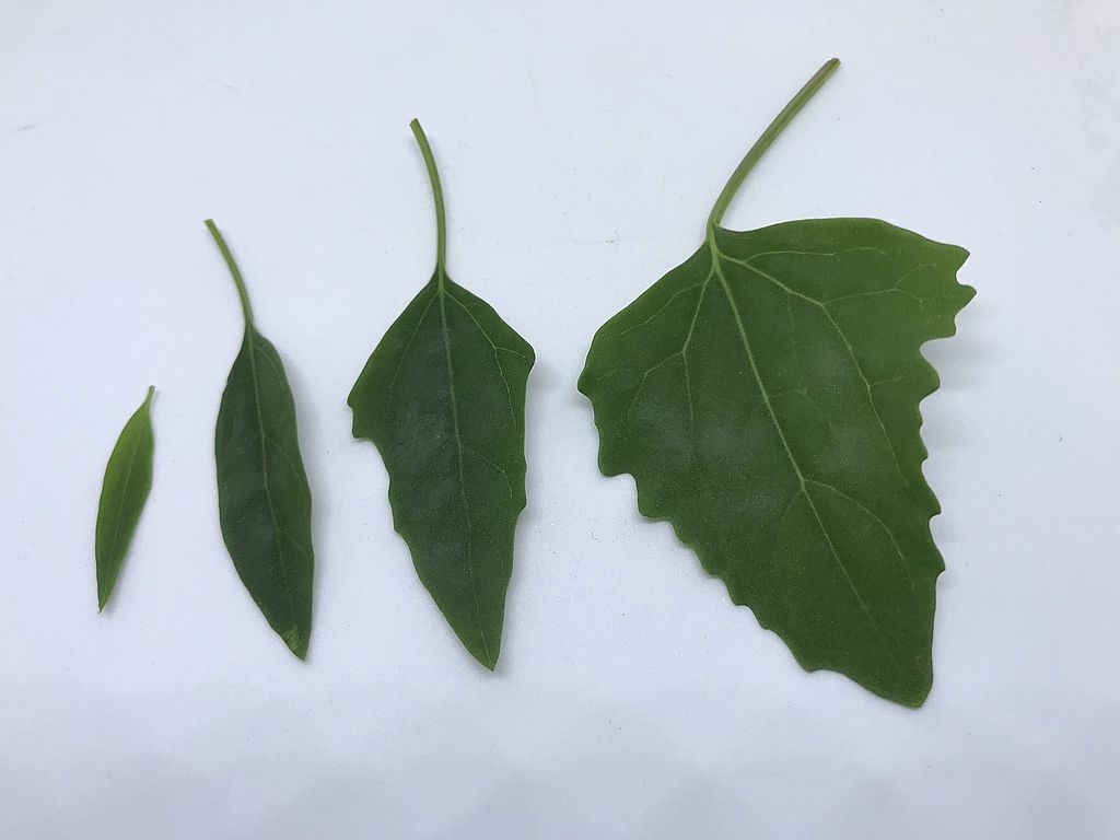 Von links nach rechts: ein Blatt aus dem Blütenstand, eines knapp unterhalb des Blütenstandes, ein kleines und ein voll ausgebildetes Laubblatt.