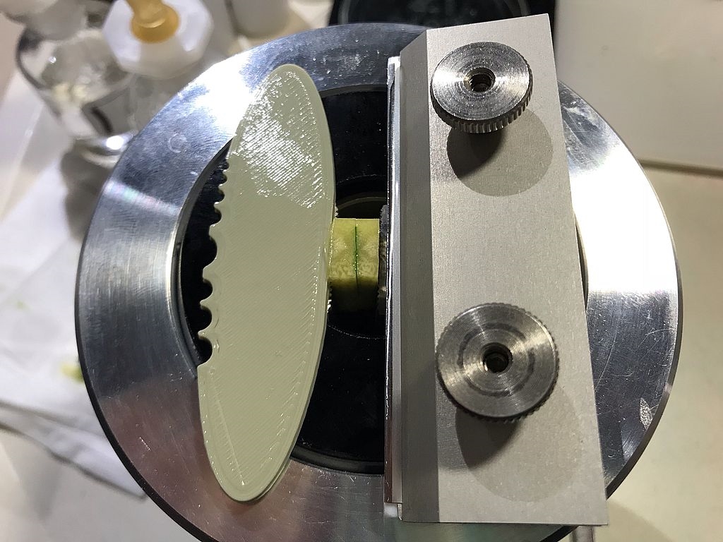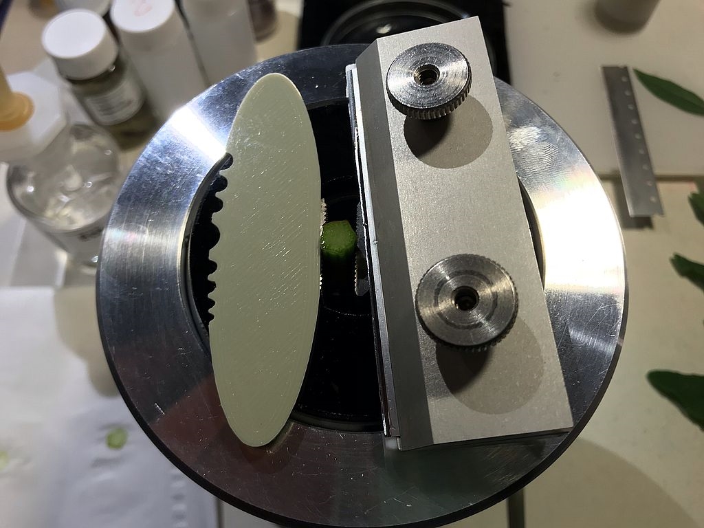 Diesmal kam eine von Bob entwickelte kleine Schneidehilfe zum Einsatz, die es erlaubt, die Probe beim Schnitt gegen das Messer abzustützen. Das Kunststoffplättchen mit vielen praktischen Kerbungen für unterschiedlich starke Proben oder auch ein Möhrenklötzchen geht auf Rainer Täubners Praxis zurück, seine Schnitte mit zwei übereinander gelegten Objektträgern abzustützen. Somit wird ein kleiner Nachteil des SHK Halters aufgefangen, der ja wegen des Teflon-Gleiters deutlich oberhalb der Glasplatte eines Handzylindermikrotoms schneidet.