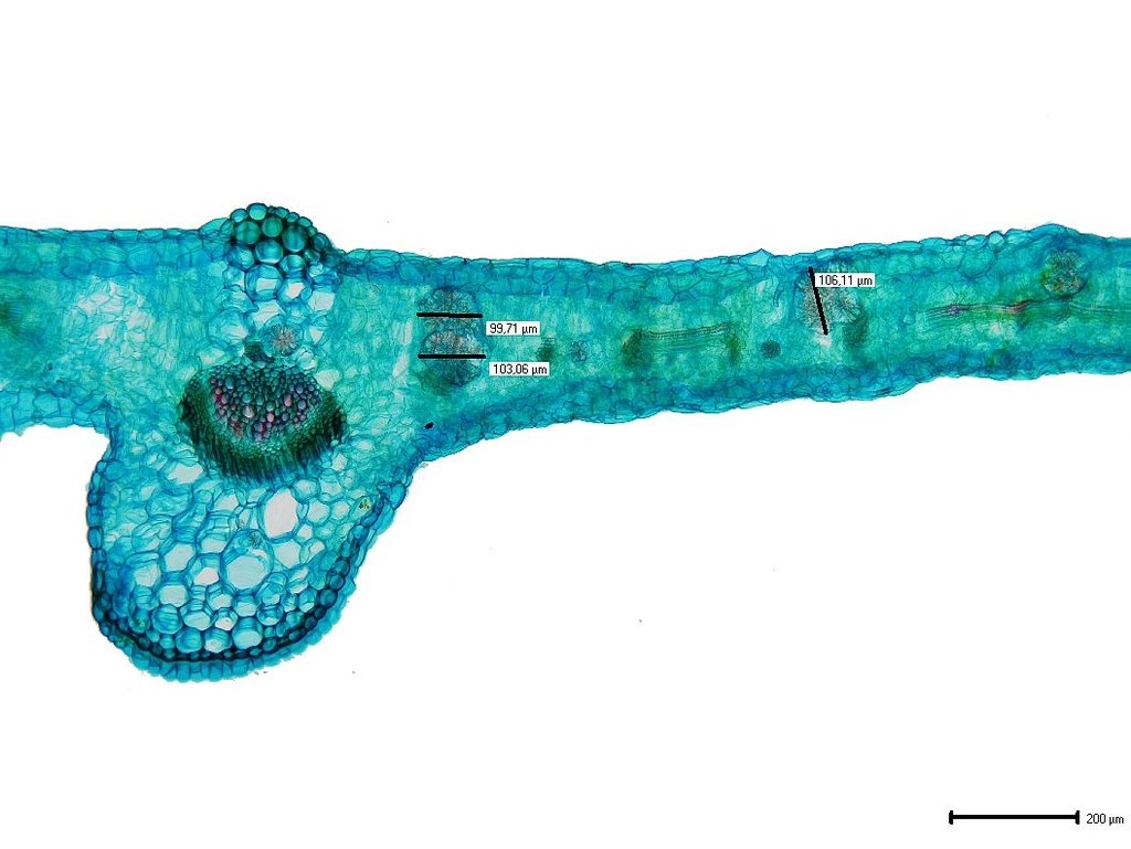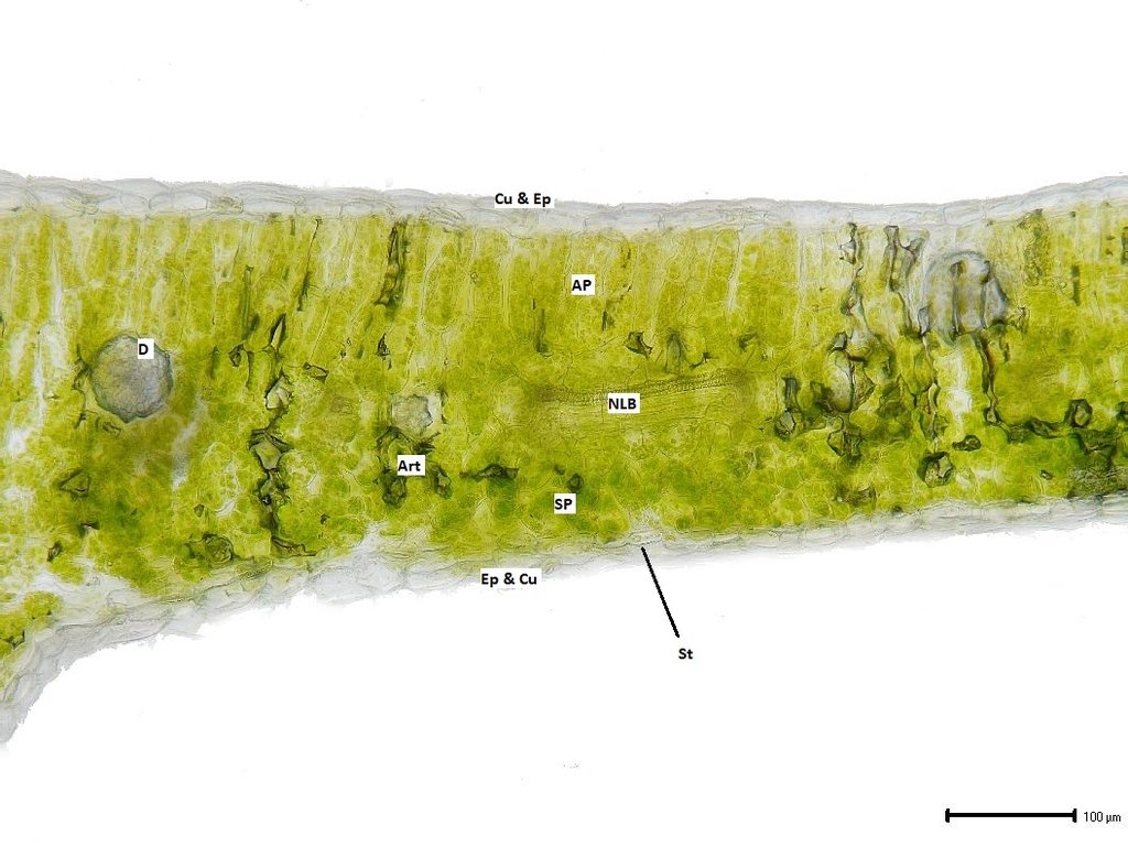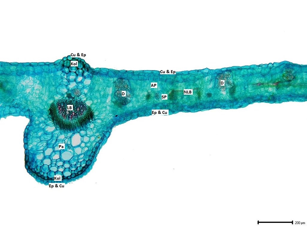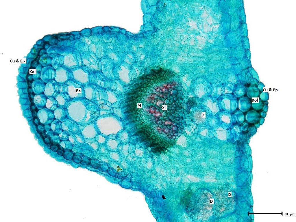 Wir finden ein klassisches bifaziales Blatt mit Assimilationsparenchym und Schwammparenchym in der Blattspreite. Die Mittelrippe ist auf der Blattunterseite erhaben und wird oben und unten von kleinen Kollenchymen stabilisiert. Insbesondere in der Blattspreite gibt es wieder jede Menge Calciumoxalatdrusen. Und die führen mit ihrer außergewöhnlichen Größe zum Ausreißen der Schnitte, da sie vom Messer oft nicht zerteilt sondern mit geschoben werden: