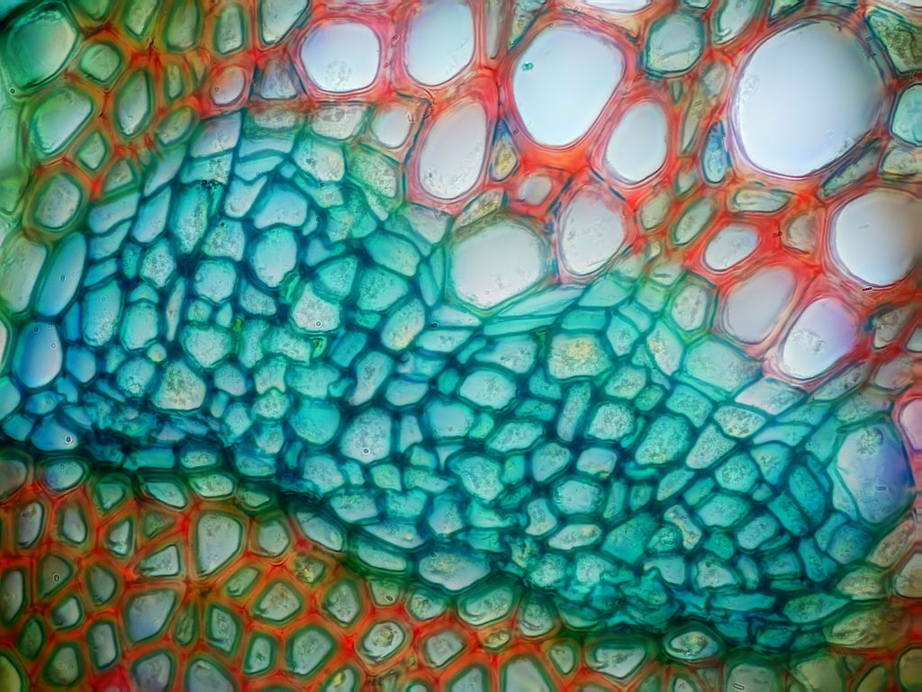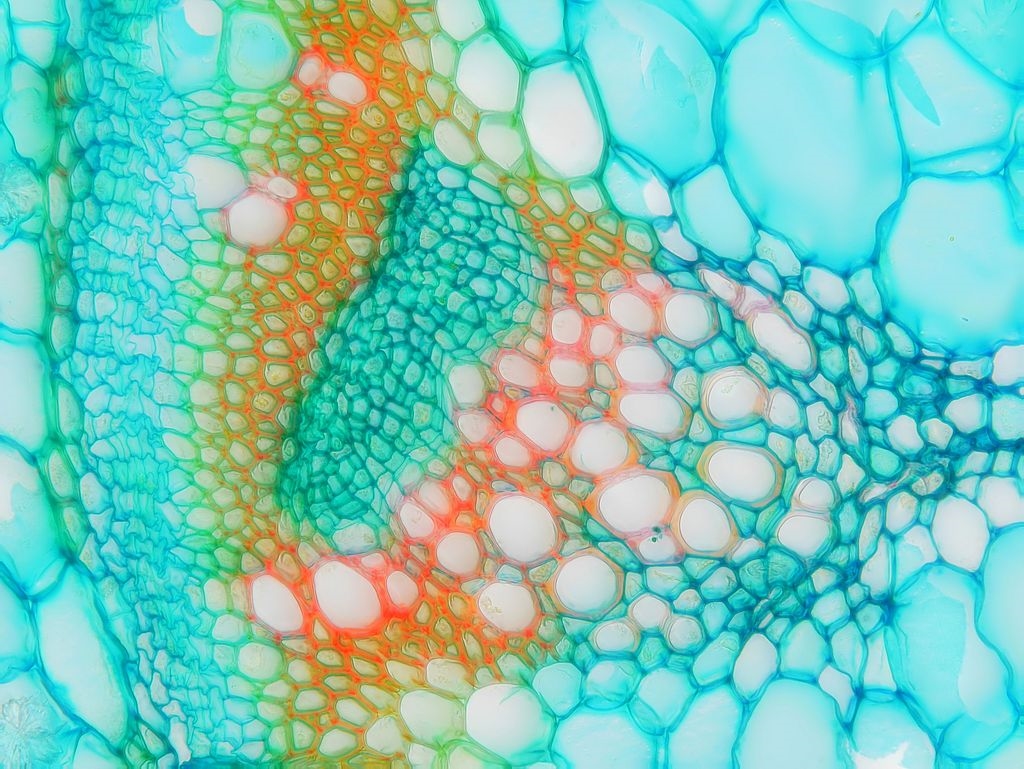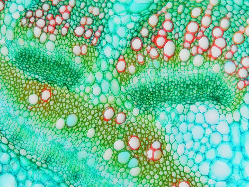 Bilder 17a-i: Impressionen von den Leitgeweben im Spross des Weißen Gänsefußes, Bilder 16a&b vom frischen Schnitt, alle anderen Aufnahmen gefärbt. Bilder 17b,d,f&h mit Beschriftung; alle Aufnahmen gestapelt