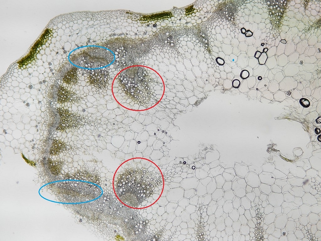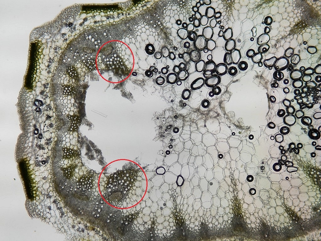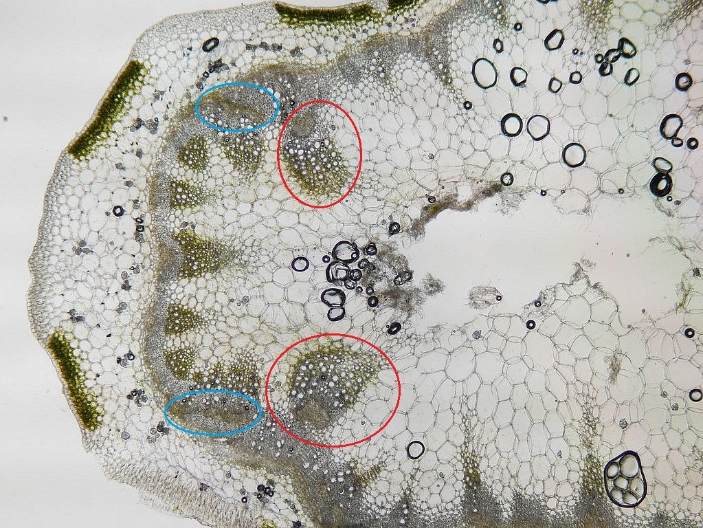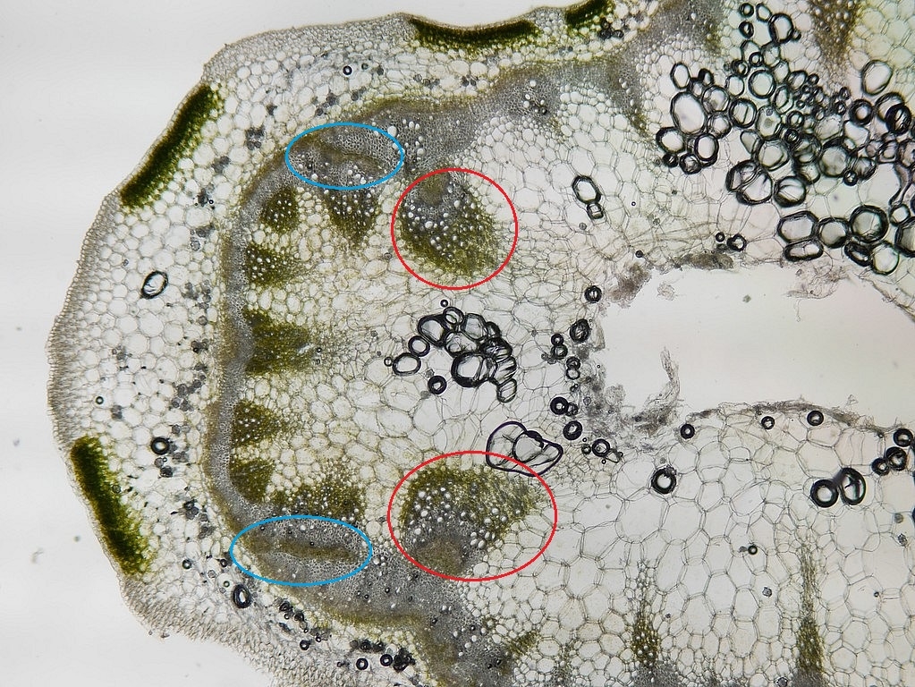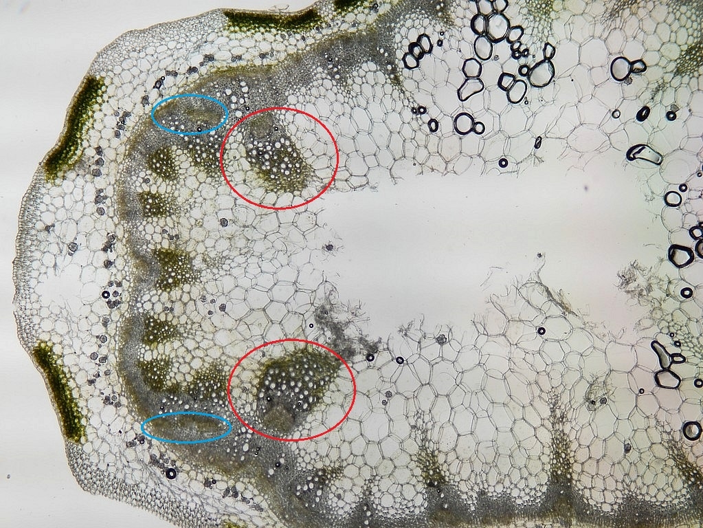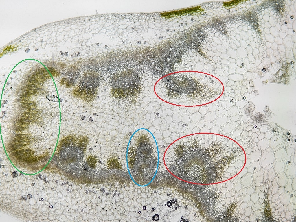 Schaut man aber genauer hin, wird klar, dass der Leitbündelring nicht ganz so klassisch aufgebaut ist. Wir sehen einen recht dünnen Phloemring, in dem Gruppen von Sieb- und Geleitzellen in einem Phloemparenchym eingebettet sind. Dahinter liegt - ohne erkennbares Cambium - ein Xylemring mit Tracheen und Tracheiden. Soweit so gut.  An einigen Stellen folgt nun aber in der Form eines eigenständigen Leitbündels eine Phloeminsel und ein weiteres Xylem. Die Phloeminsel macht die Struktur auffällig: so etwas ist recht selten uznd war hier im Forum bisher nur bei der Gartenmelde von Hans-Jürgen zu sehen.