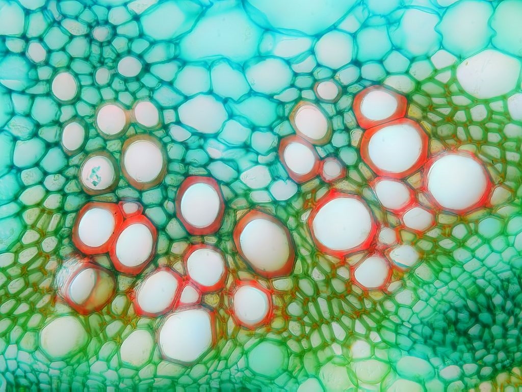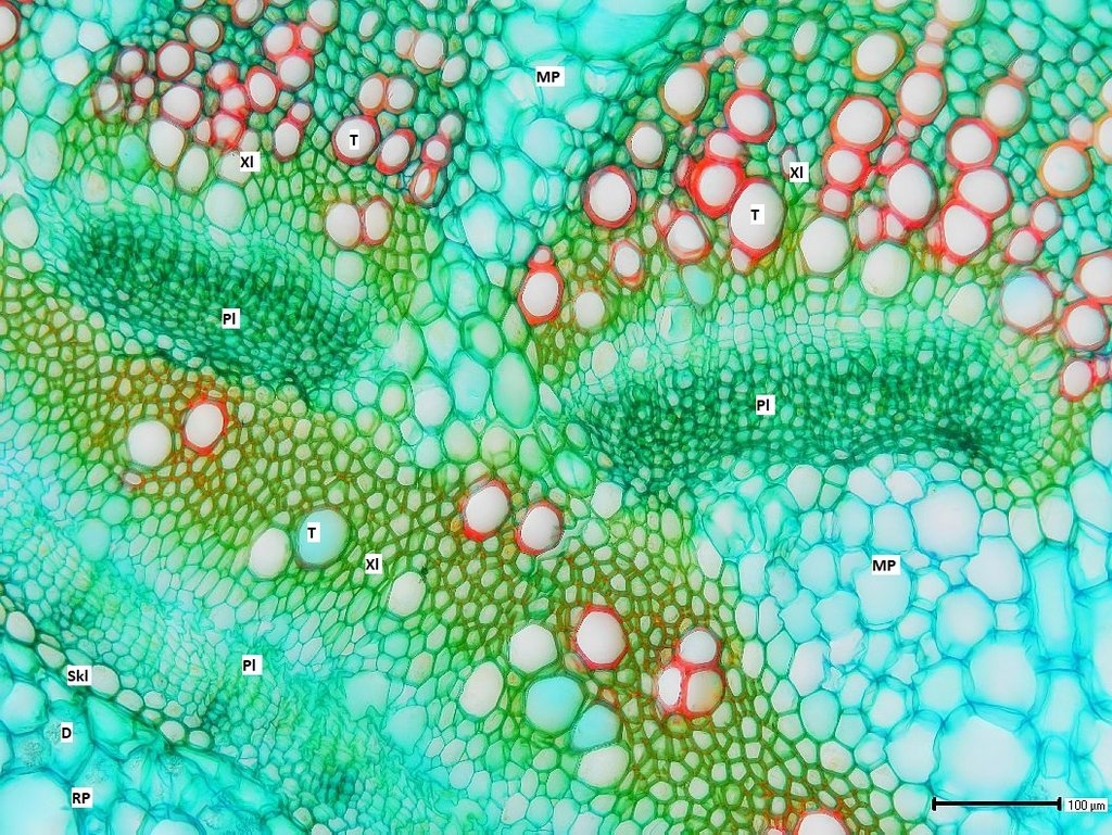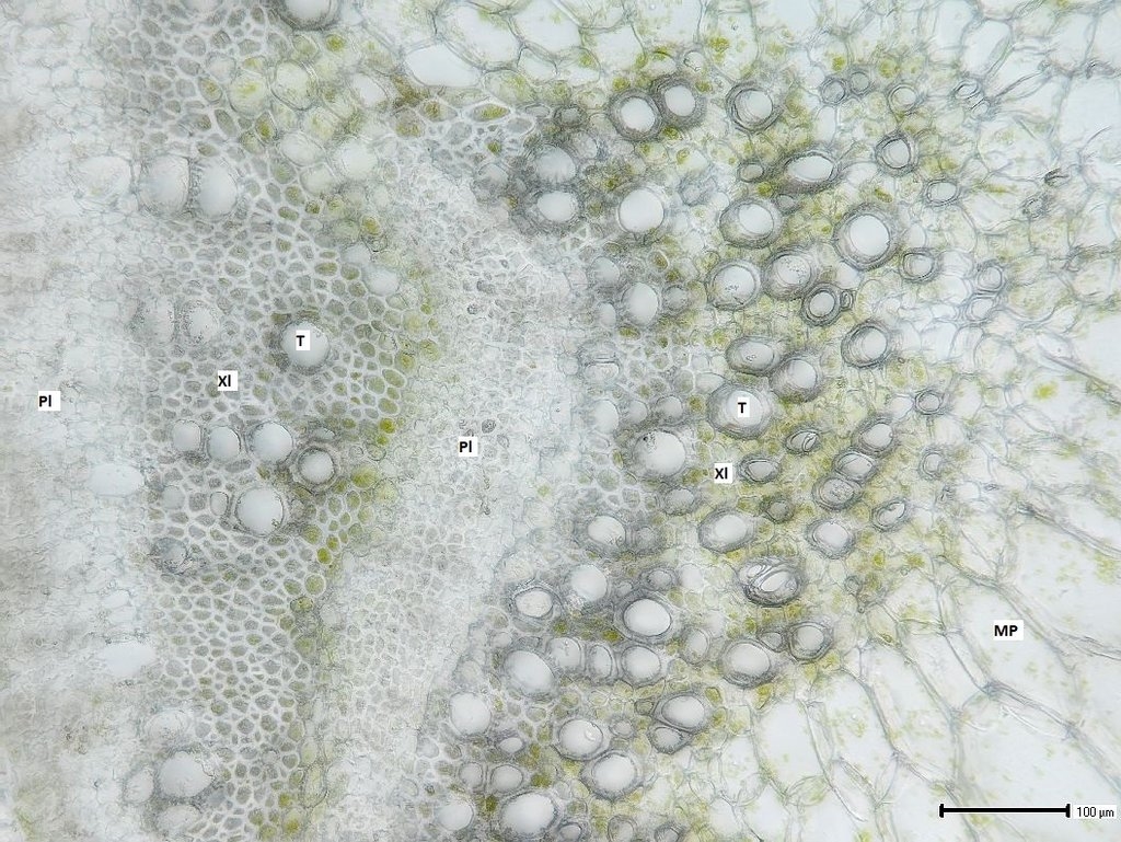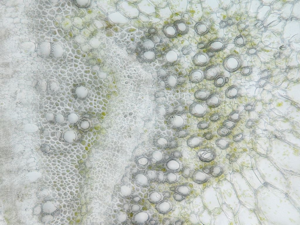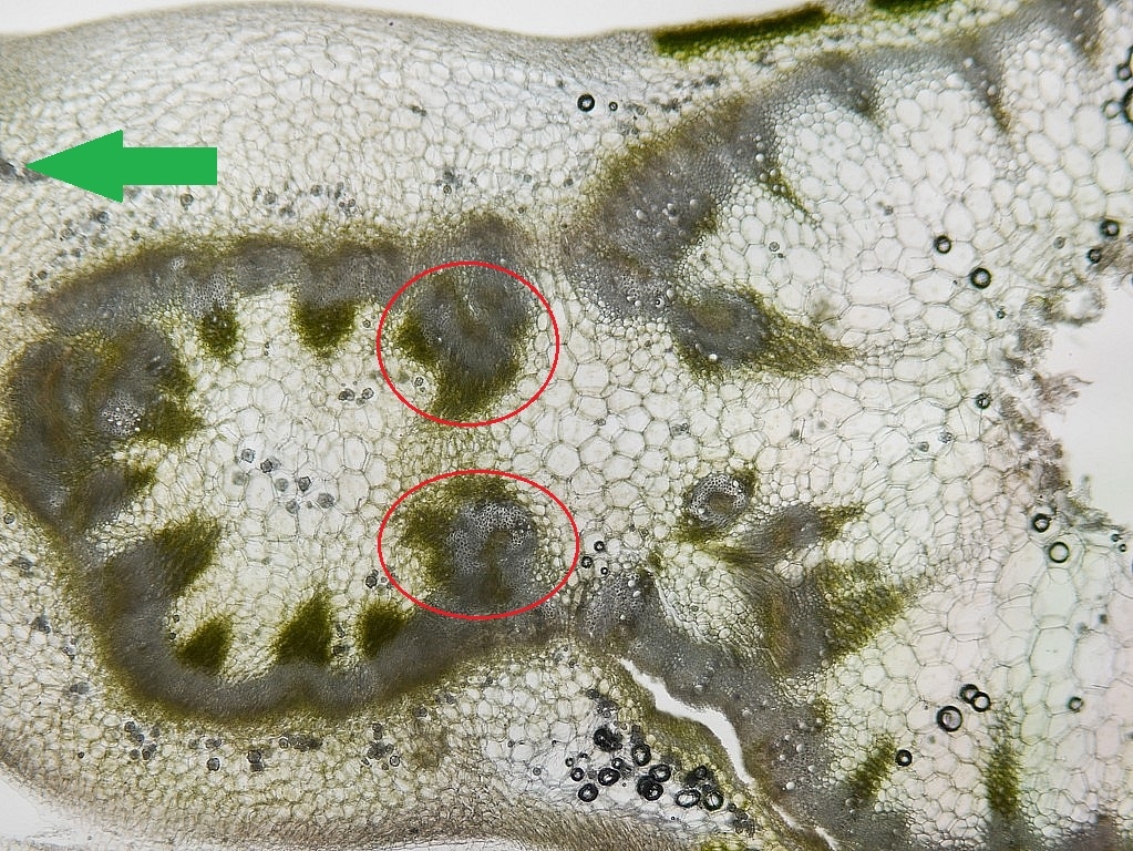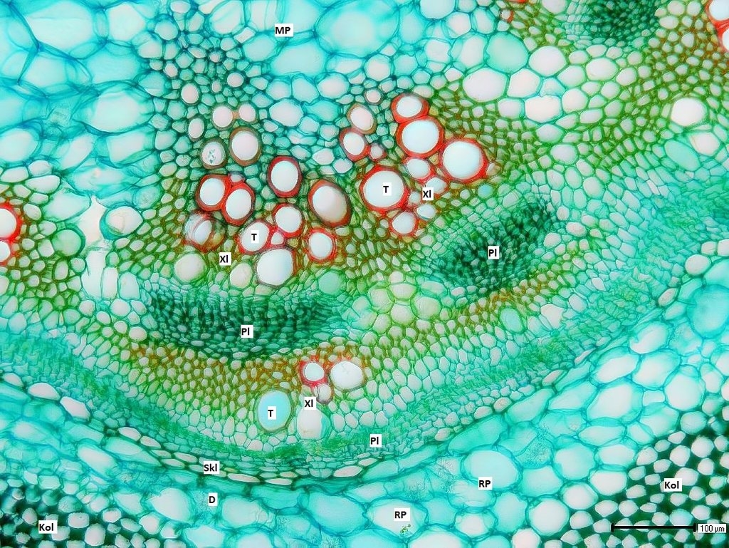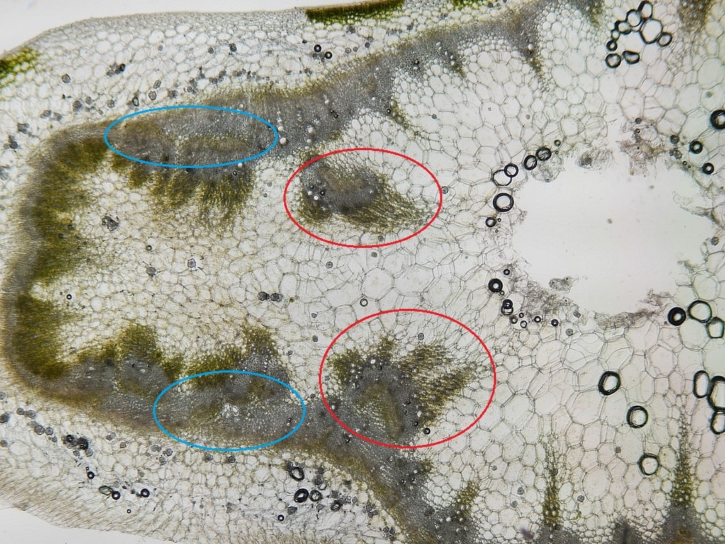 Schaut man aber genauer hin, wird klar, dass der Leitbündelring nicht ganz so klassisch aufgebaut ist. Wir sehen einen recht dünnen Phloemring, in dem Gruppen von Sieb- und Geleitzellen in einem Phloemparenchym eingebettet sind. Dahinter liegt - ohne erkennbares Cambium - ein Xylemring mit Tracheen und Tracheiden. Soweit so gut.  An einigen Stellen folgt nun aber in der Form eines eigenständigen Leitbündels eine Phloeminsel und ein weiteres Xylem. Die Phloeminsel macht die Struktur auffällig: so etwas ist recht selten uznd war hier im Forum bisher nur bei der Gartenmelde von Hans-Jürgen zu sehen.