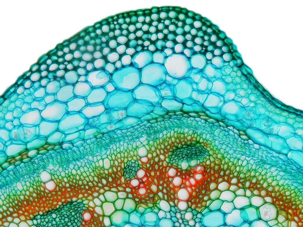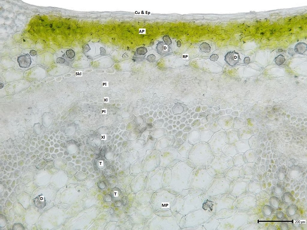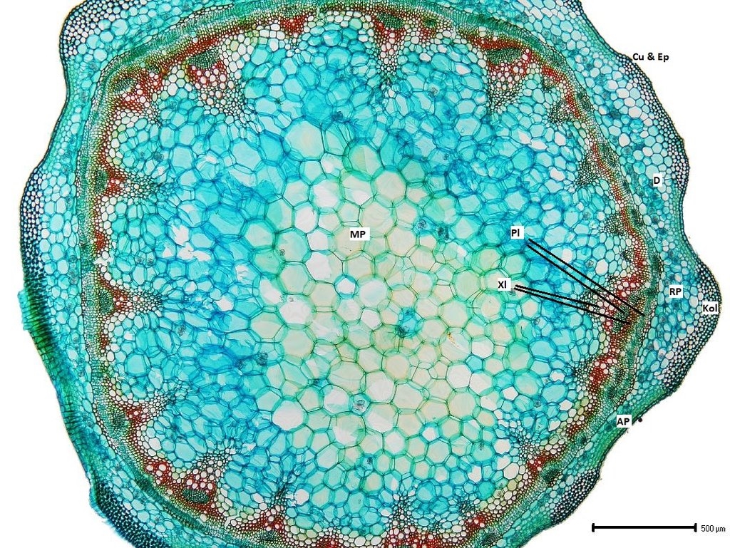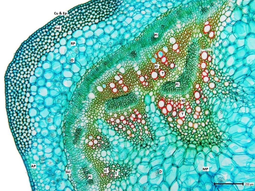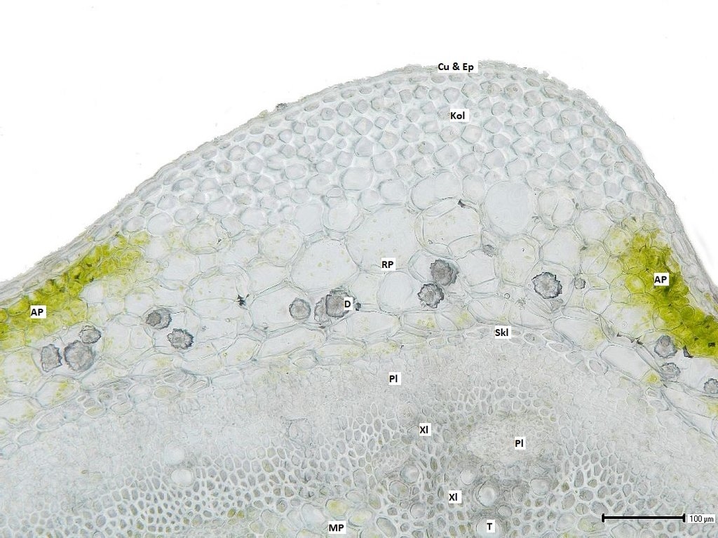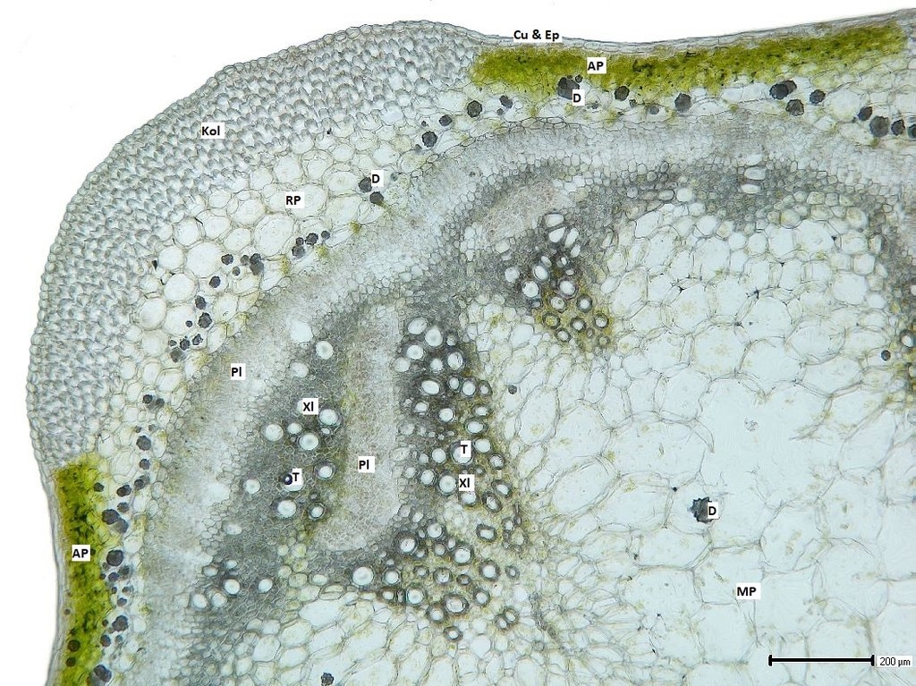 Auf den ersten Blick erkennen wir den typischen Sprossaufbau einer krautigen Pflanze: von Außen nach Innen finden wir an den Ecken des polyedrischen Sprossquerschnitts ausgeprägte Kantenkollenchyme zur Stabilisierung der Struktur. Dazwischen finden wir, in den frischen Schnitten schön zu sehen, Felder, deren Zellen viele Chloroplasten enthalten (daher hier als AP gekennzeichnet). Darunter folgt ein Rindenparenchym, in das eine Vielzahl von Calciumoxalatdrusen eingebettet ist. Dann - teils unterbrochen - ein feiner Ring wenig lignifizierter Sklerenchymfasern. Darunter dann der Leitbündelring und das Markparenchym, das ebenfalls einige Calciumoxalatdrusen enthält.