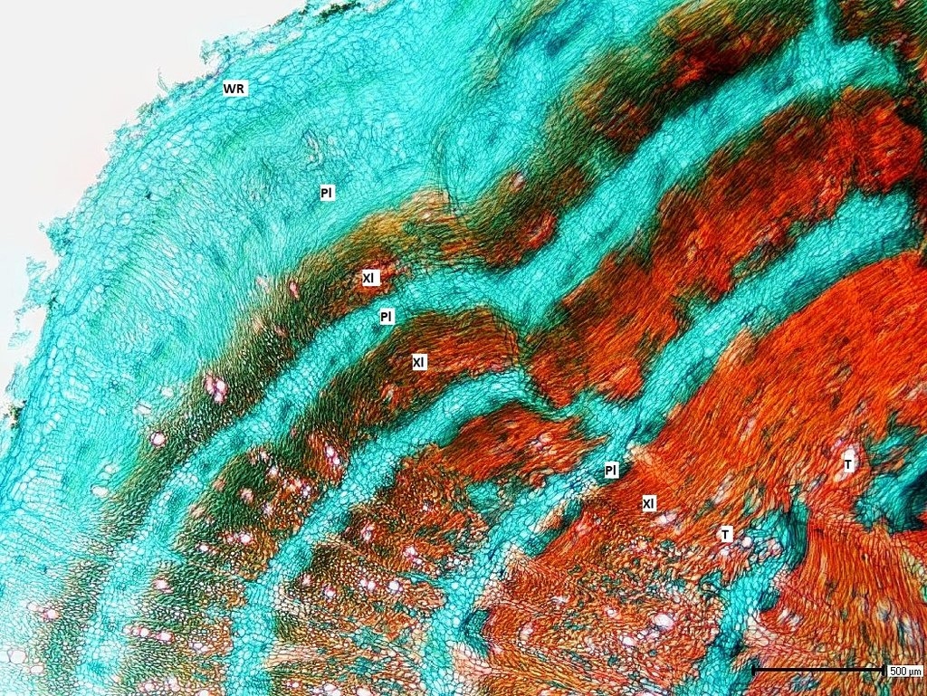 Leider ist der Schnitt durch und an der Seitenwurzel etwas dick geraten, aber die Anbindung an die Gewebe der Hauptwurzel ist trotzdem gut zu erkennen.