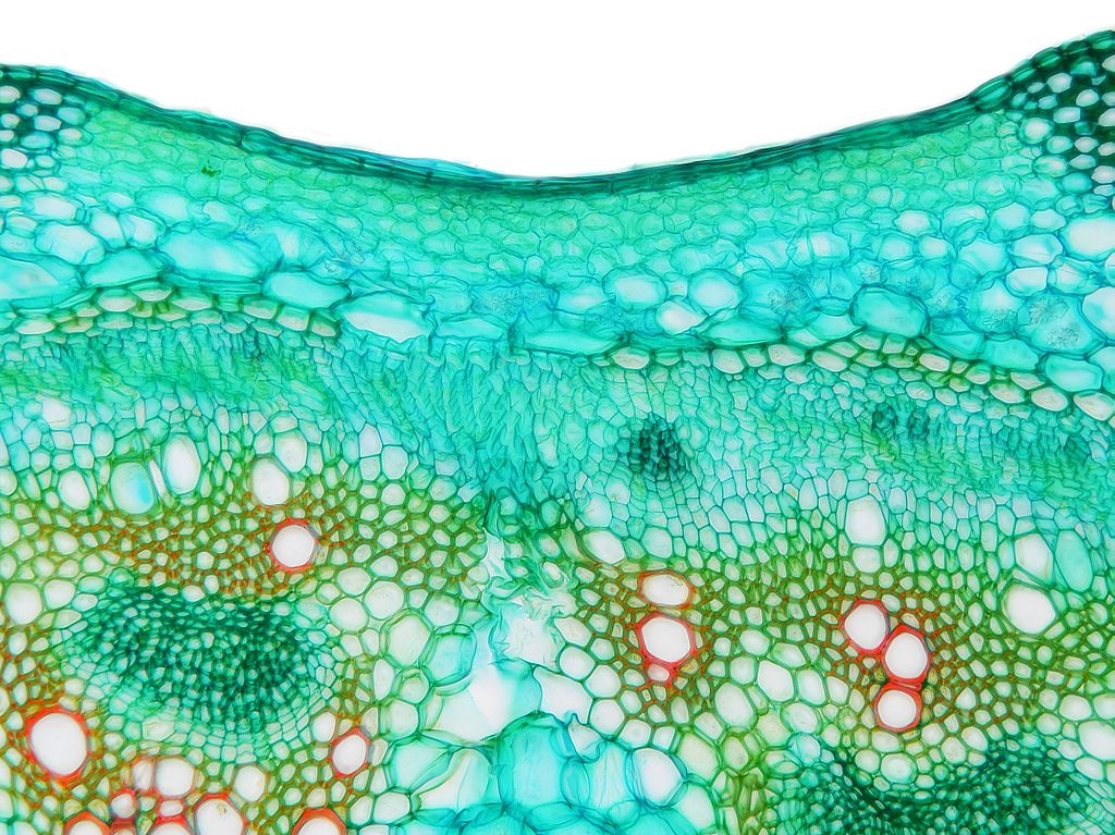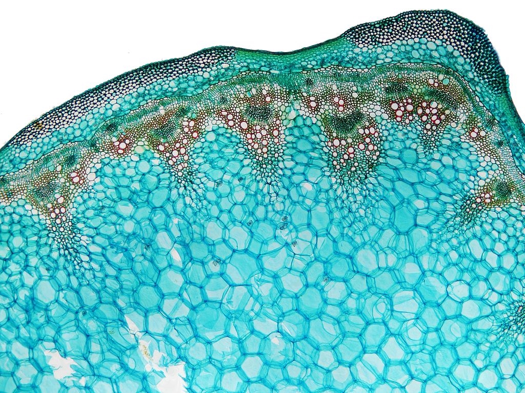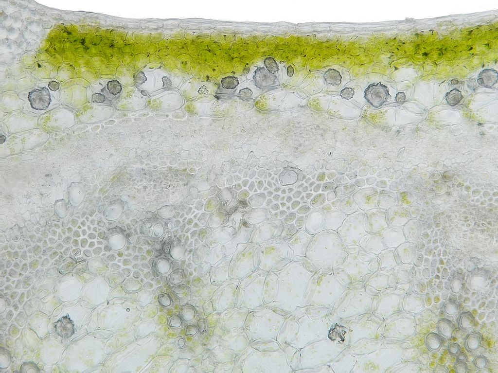 Im Gegensatz zum Rindenparenchym sitzen die Chloroplasten in den kleineren Zellen zwischen den Kollenchymen ähnlich dicht, wie in den Assimilationsparenchymen von Blättern.