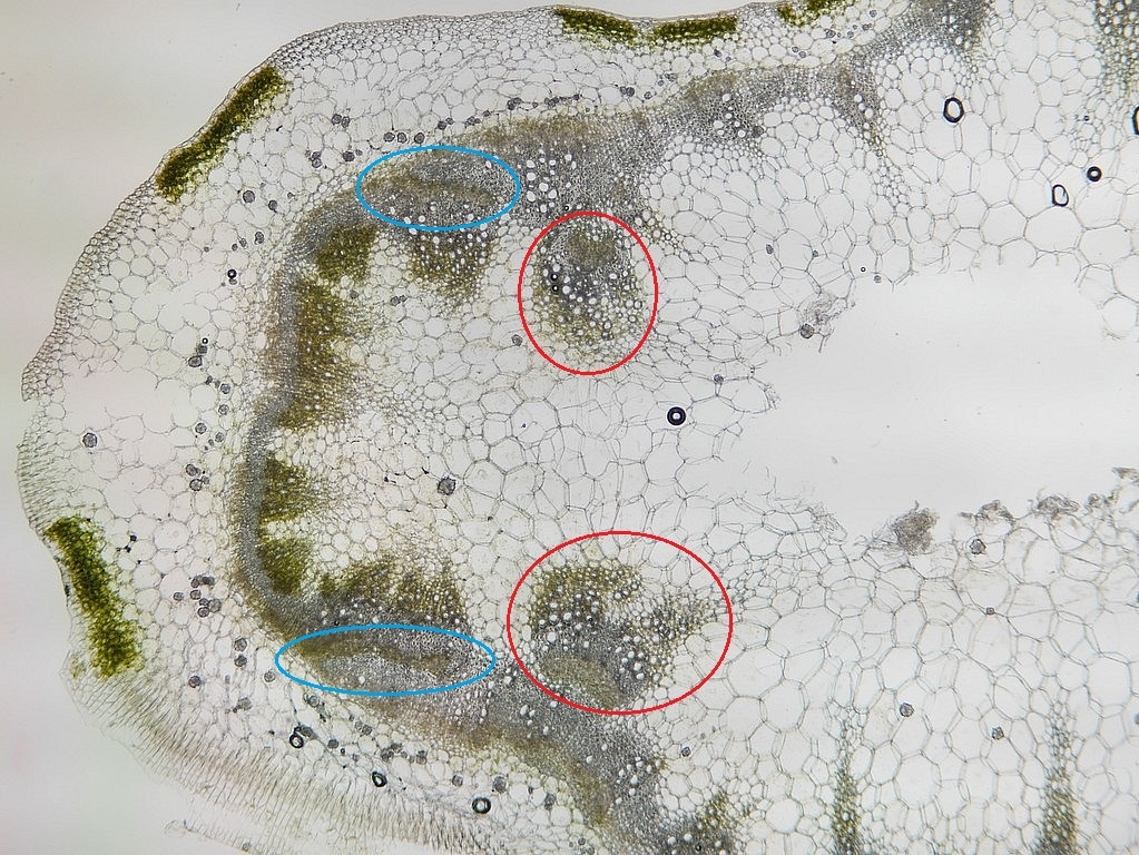 In den oben gezeigten Bildern wird die außergewöhnliche Abfolge Phloem - Xylem - Phloem - Xylem noch einmal an verschiedenen Beispielen deutlich. Spannend finde ich, dass es im Phloemring nur sehr kleine Flächen mit Sieb- und Geleitzellen zu geben scheint, während die Phloeminseln der Blattspuren doch recht stark ausgeprägt sind.
