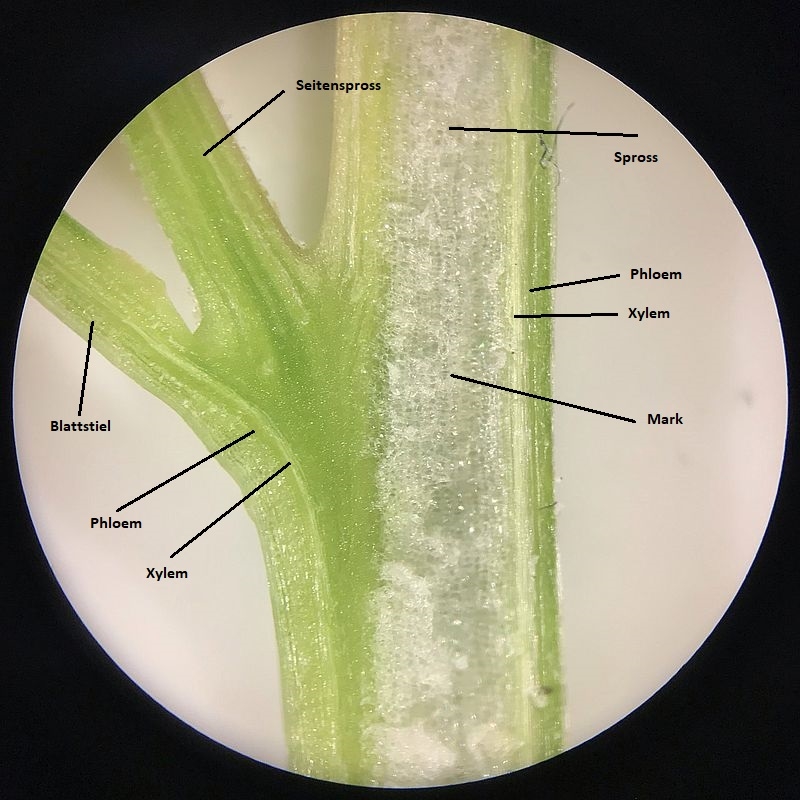 Anhand der hellen Streifen (Xylem) kann man den Verlauf der Leitbündel erkennen, aber die Strukturen sind für einen Beweis zu klein.