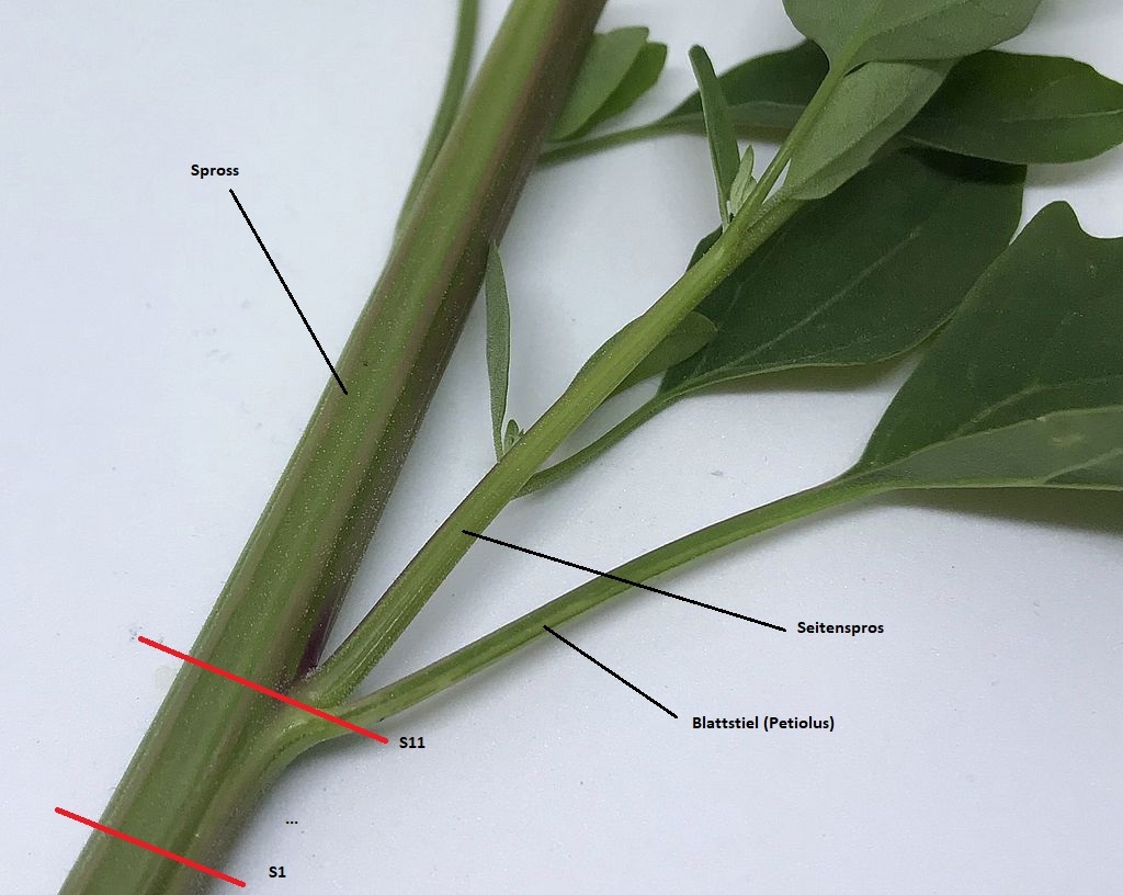 Beginnen möchte ich mit dem Spross, der eine Besonderheit aufweist, die uns schon bei der Gartenmelde beschäftigt hat und von Detlef mit dem Verweis auf die ANATOMY OF THE DICOTYLEDONS, VOLUMES I AND II, von C. R. Metcalfe und L. Chalk aufgeklärt wurde. Aber immer der Reihe nach!