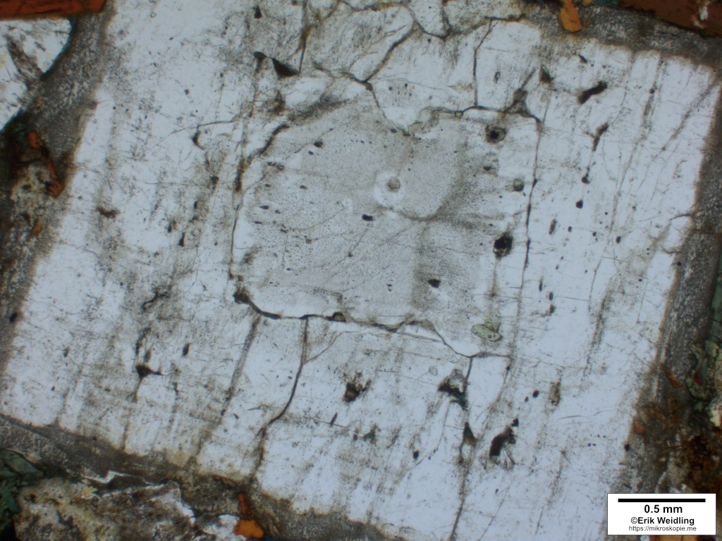 entmischungslamellen sehe ich da nicht. Mir kommt es so vor, als würden da an dem Korn keilförmig auslaufende Korngrenzen vorliegen, die die konzentrischen Ringe verursachen.  Ein Loch im Schliff ist es ja wohl nicht, dafür ist es wohl zu farbig bei //  Pol? Wie sieht denn das Achsenbild aus, wenn es ein Schichtsilikat wäre, würde es wahrscheinlich dafür sehr günstig orientiert geschnitten sein. Für Serpentin sind mir die Interferenzfarben viel zu hoch, uns auch die Eigenfarbe kommt m.E. nicht hin.