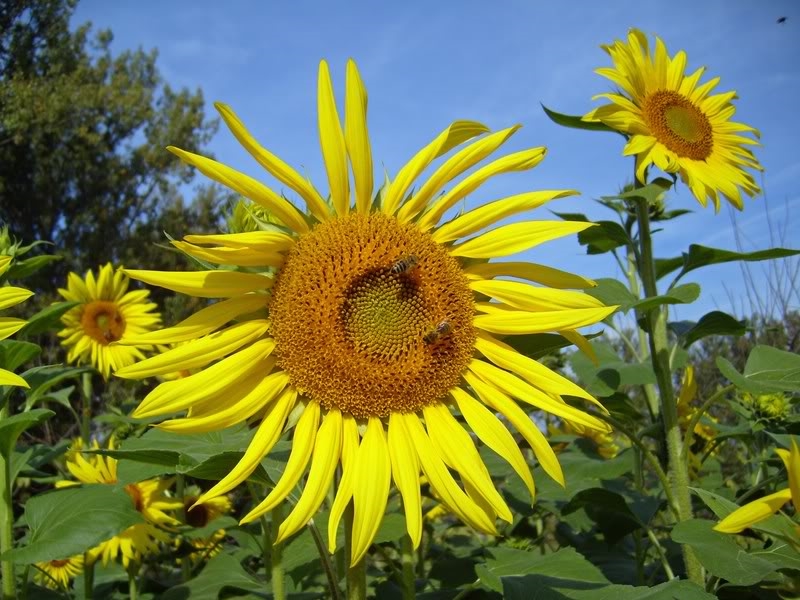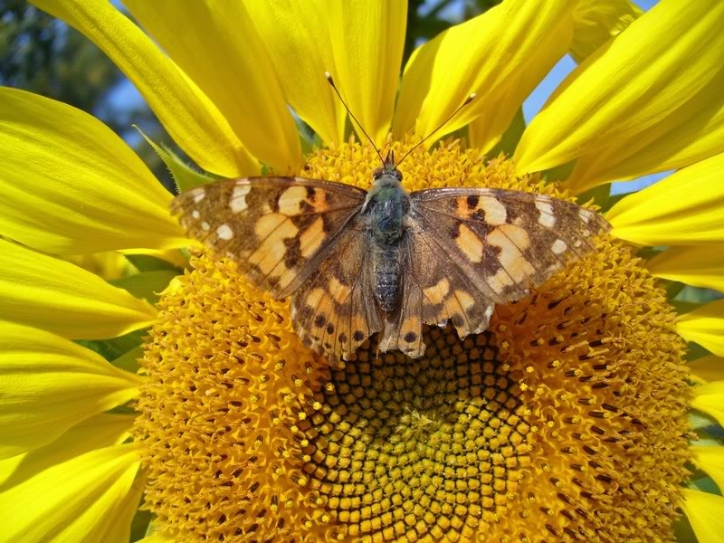 hier noch zwei Bilder mit Sonnenblumen, auf dem unteren tankt ein schon lange wandernder Distelfalter neue Nahrung für seine letzten Wege: