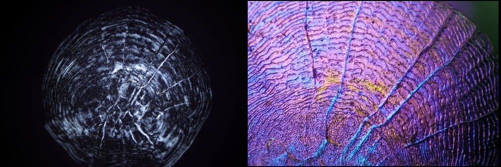Zum Präparat: da sich Fischschuppen beim Trocknen aufrollen, habe ich sie in einem Schälchen mit Wasser aufbewahrt. Das muß man regelmäßig wechseln, weil es sehr schnell stinkt. Dann habe ich die Schuppe, welche riesengroß ist, zwischen zwei Objektträger mit ausreichend Wasser geklemmt und mikroskopiert.
