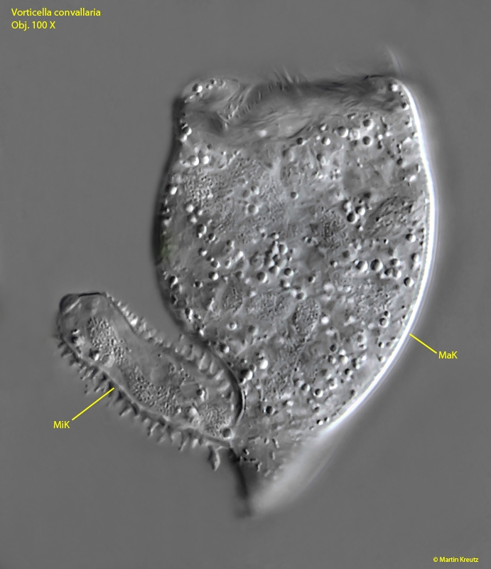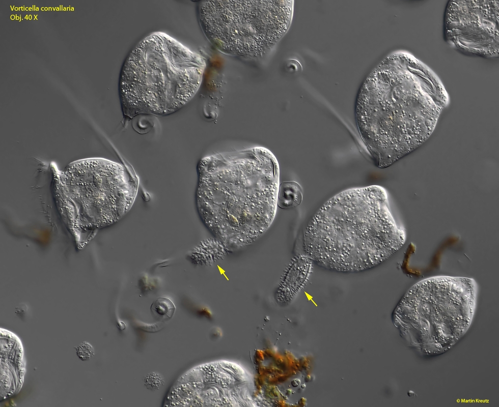Vorticella erkennt man sehr leicht. Es handelt sich immer um Einzelindividuen mit einem spiralig kontrahierenden Stiel. Vorticella convallaria ist mit bis zu 80 µm recht groß, hat einen J-förmigen Makronukleus, nur eine KV, einen etwas asymmetrischen Körper und eine sehr feine Streifung. Der Streifenabstand bei meinen Individuen betrug 0,53 µm: