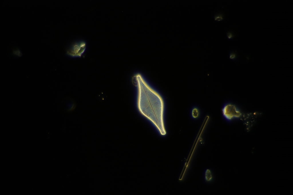 Eigentlich war für mich der ,,Faden" mit dem Zeigen von Bildern unterschiedlicher, interessanter Diatomeen, die ich in ein und demselben Präparat ,,entdeckt" habe, abgeschlossen. Jetzt habe ich  aber darin noch eine ,,blau strahlende" (im DF) Diatomee entdeckt, die ich bisher noch nicht gesehen habe.