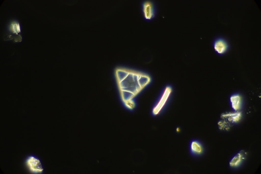 Als besonders vorteilhaft für die Prüfung hat sich dabei erwiesen, die Proben im ,,Dunkelfeld" (10-fach Objektiv, 10X Okular, DF) zu untersuchen. Dies gilt insbesondere nach der ,,chemischen Reinigung" mit konz. Schwefelsäure, Kalium-Permanganat, Wasserstoff-Peroxid. Im DF gibt die jetzt freigelegte Feinstruktur vieler Diatomeen strahlende, farbige Interferenz Erscheinungen von tief blau über blaurot bis rötlich. Mineralische Partikel/Verunreinigungen  wie Ton und feiner Sand erscheinen strahlend weiß.