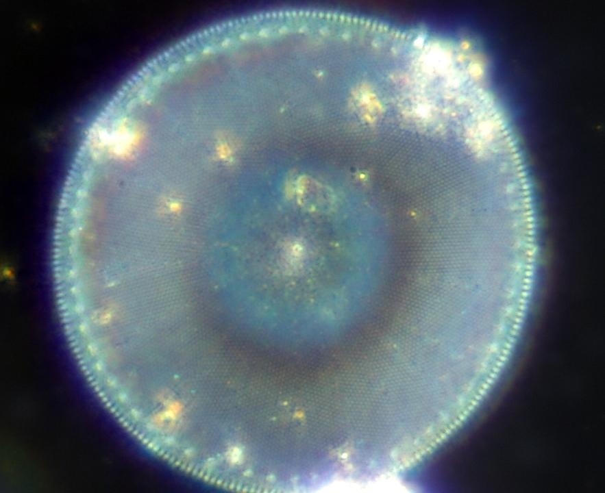 Die blaue Farbe im Dunkelfeld kann m.W. nur durch Interferenz der Feinstruktur als optisches Gitter (sehr feines Einfach- oder Mehrfach- Feinstrukturgitter) entstehen. Dies trifft auf viele Diatomeen mit entsprechender Feinstruktur zu. Bei der gezeigten, im DF tief blau erscheinenden Diatomee ist dieses Phänomen besonders ausgeprägt. (Tief blau im Dunkelfeld erscheinen nach meiner Erinnerung ,,Amphipleura"-Diatomeen, deren Feinstruktur im Grenzbereich der lichtmikroskopisch möglichen  Auflösung liegt. Hat denn ,,Thalassiosira punctigera" eine ähnlich ausgeprägte  Feinstruktur?)