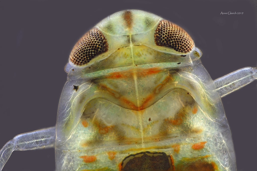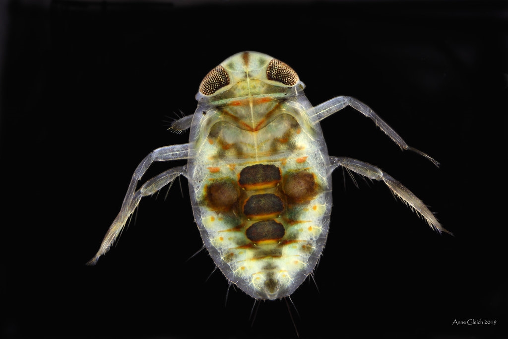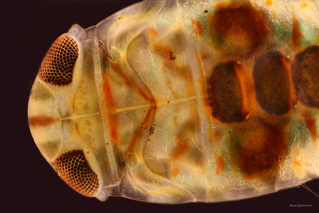 Bob, die Bilder sind mit dem 4er und 10er Objektiv gemacht. da ich kein Dunkelfeld habe für diese Objektive, habe ich für die ersten 2 Bilder ganz ohne Mikroskopbeleuchtung nur von der Seite mit 2 Lampen beleuchtet. Für die Bilder der Nymphe ist es ein Mischmasch aus seitlicher Beleuchtung und Pol mit Verzögerer.