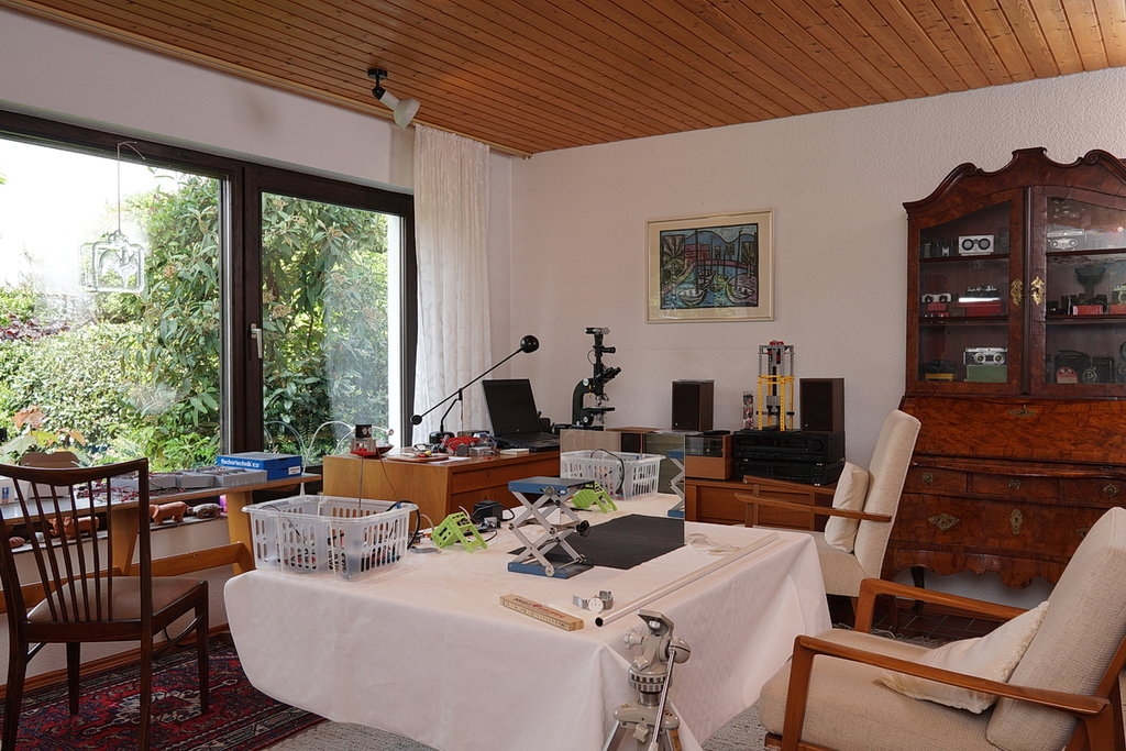 Ich bin auch gerade intensiv dabei, mein Arbeitszimmer fertigzubauen und zu möblieren. Es ist ein kleiner Raum im Obergeschoss mit viel Dachschräge und nur 2,25 Raumhöhe. Den Heizkörper habe ich durch ein niedriges, langes Exemplar ausgetauscht, dass jetzt in der Dachschräge angebracht ist. Statt 2 habe ich jetzt 20 Steckdosen. Der neu (2016) gebaute Erker hat gerade (hat nur 3 Jahre gedauert, mühseligster Quadratmeter, den ich bislang gebaut habe) seinen Dielen-Fußboden bekommen und wartet auf den restlichen Ausbau und zwei Edelstahl-Profile außen. Einen zusätzlichen Tisch mit Schrankunterbau und eine Schrankwand habe ich fertig. So langsam nähert es sich also der Fertigstellung und ich brenne schon darauf, unter etwas günstigeren Bedingungen mikroskopieren zu können.