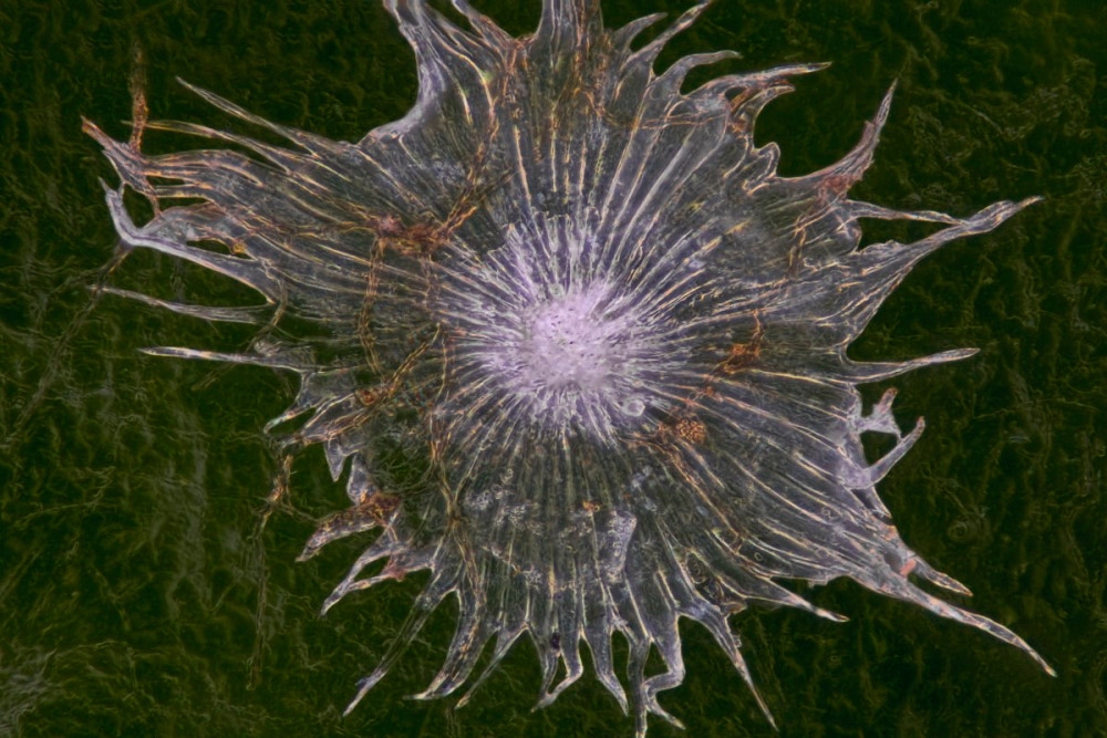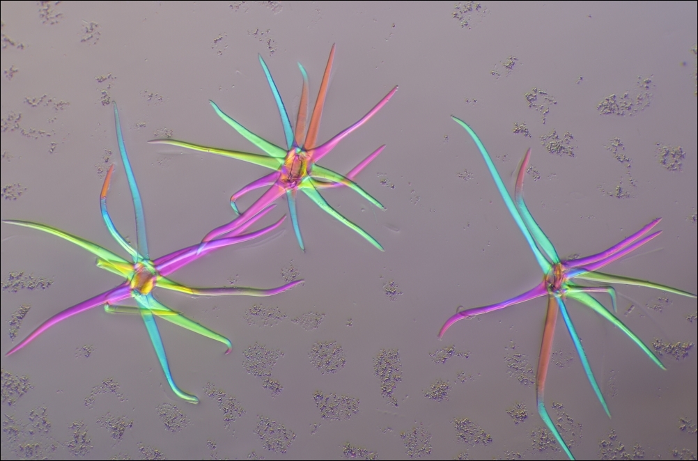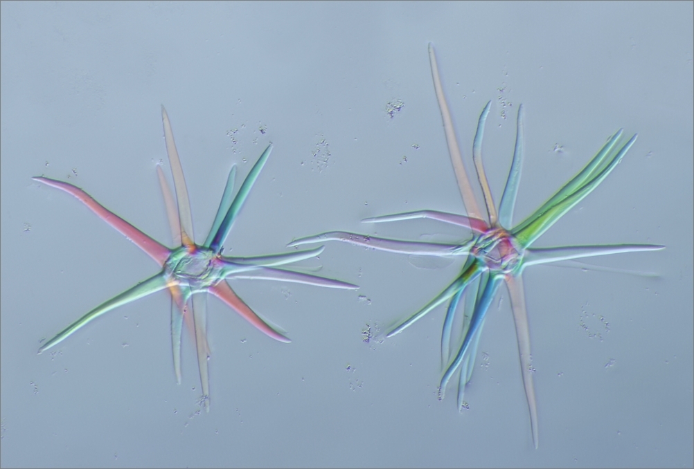 die einfachste ist ja sehr oft die zutreffende Variante. Der Nagellack auf dem OT hat hier zwei Trichome ,,mitgenommen". Polarisiertes Licht mit Verzögerer, schiefer Beleuchtung und ,,natürlich" mehrere Ebenen, die verrechnet sind.