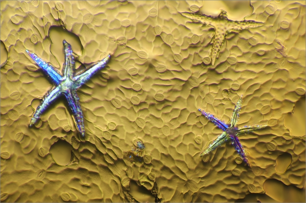 ich denke, das ist ein mit Orange-Blauem Reinbergfilter schief beleuchteter Lackabdruck, in dem die echten Sternhaar noch fest sitzen und deshalb so schön in Erscheinung treten, wobei der rechte Stern auch für Pol-Licht sprechen würde in seiner Zweifarbigkeit.