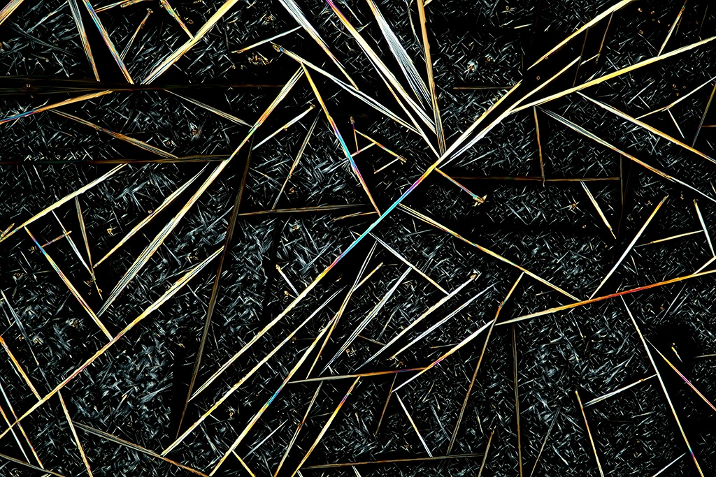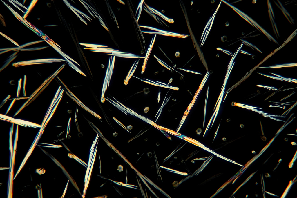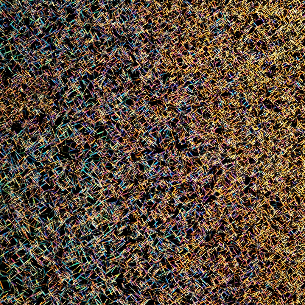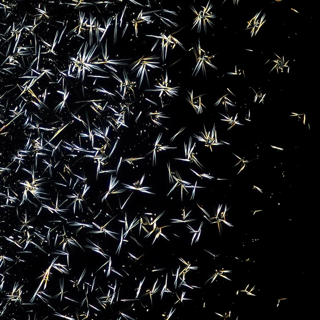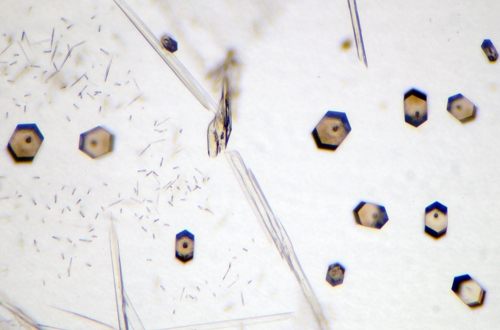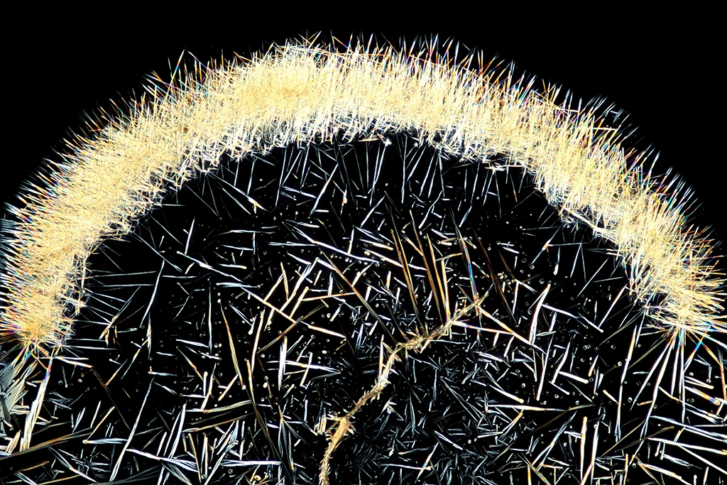 Das Bild zeigt im oberen Teil die vielen, kleinen Nadeln, die direkt bei der Sublimation entstanden sind. Dann habe ich ein Tropfen Wasser dazu gegen und wieder verdunsten lassen. Das Ergebnis ist im unteren Teil des Bildes zu sehen.