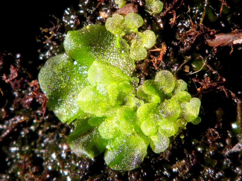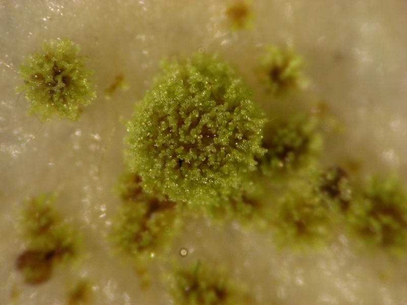 Besonders freuen würde es mich, wenn ich jemanden hier im Forum zu ähnlichen Experimenten anregen kann. Für den Königsfarn ist es jetzt zwar zu spät, aber die meisten anderen Farne dürften jetzt noch ihre Sporenreife haben. Ich möchte noch nachtragen, dass die Prothallien bisher ungefähr ein Vierteljahr gebraucht hatten, und trotzdem noch so klein sind. Bei anderen Farnen scheint das vieleicht etwas schneller zu gehen. Jedenfallls bekommen sie ja alle keine Wegzehrung in Form einer relevanten Menge an Reservestoffen in der Spore mit, und müssen sich alles selbst erarbeiten. Zum Schluss als kleine Zugabe noch ein Bild von einem Grüppchen eines unbekannten Farnes, welche sich in einem Topf ausgesäht und gekeimt hatten: