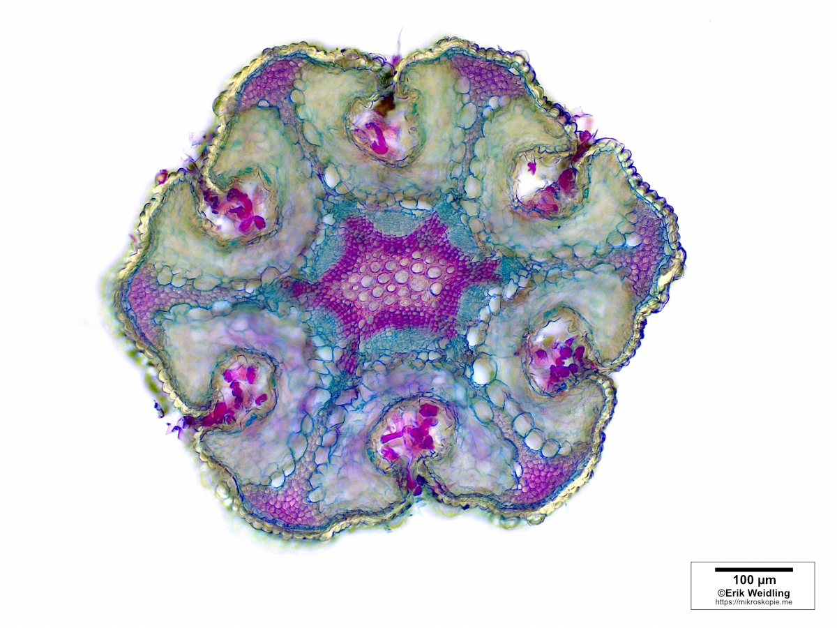 im Park fand ich einige schöne Büsche mit ,,Rundnadeln", die mich dazu inspirierten statt einem Dünnschliff mal wieder einen Dünnschnitt in Angriff zu nehmen. Geschnitten mit Rasierklinge und mit gut gereifter zehnjähriger Herrmannscher-Etzold-Grün-Färbung coloriert.