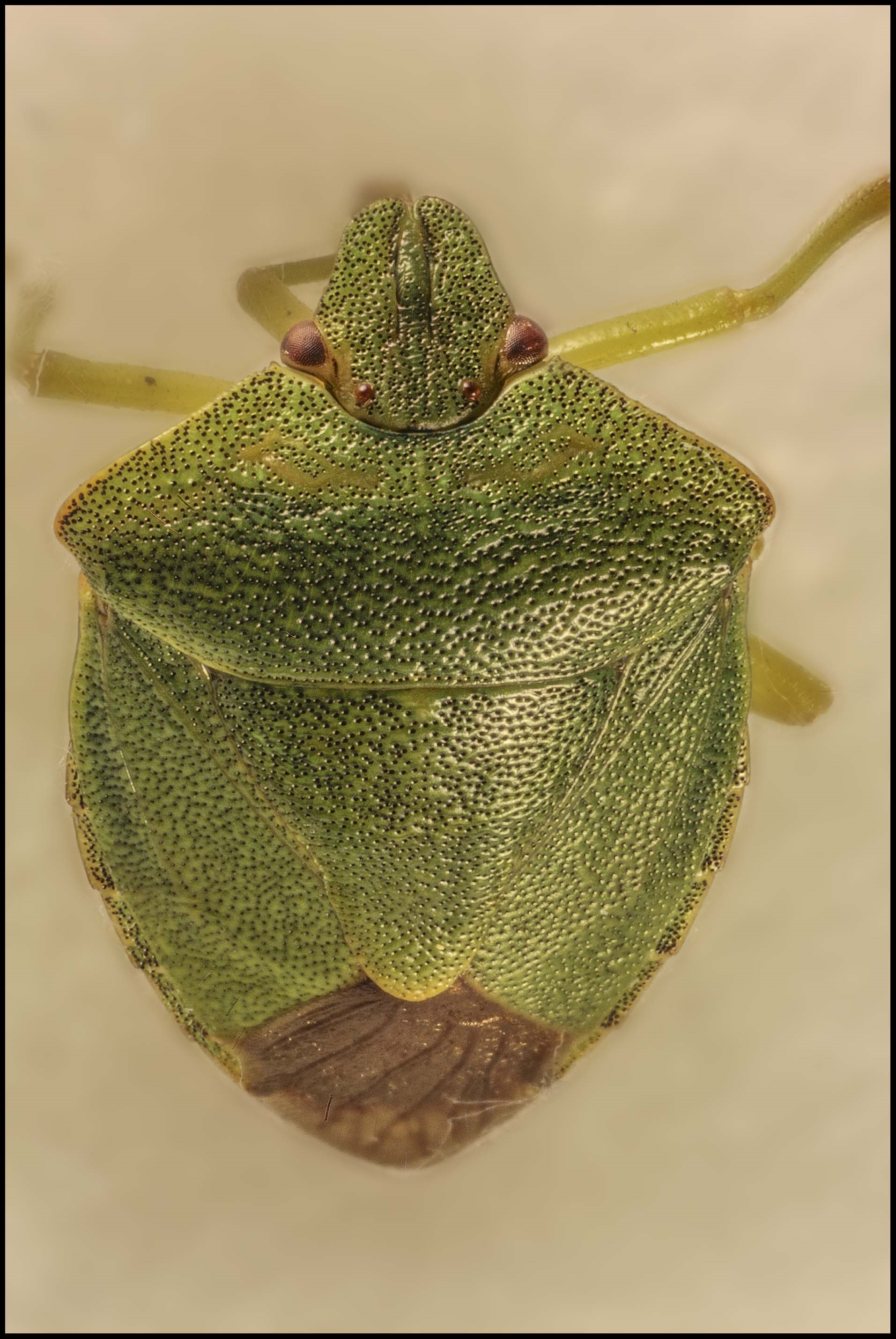 Das unfreiwillige Model war diesmal eine "Grüne Stinkwanze" (palomena prasina; prasina=lauchgrün), die das Pech hatte, im Beifang meiner Feuerwanzen zu sein. Zum Stinken gab's keine Gelegenheit mehr, weil sie schnell in Formaldehyddämpfen eingeschläfert wurde.