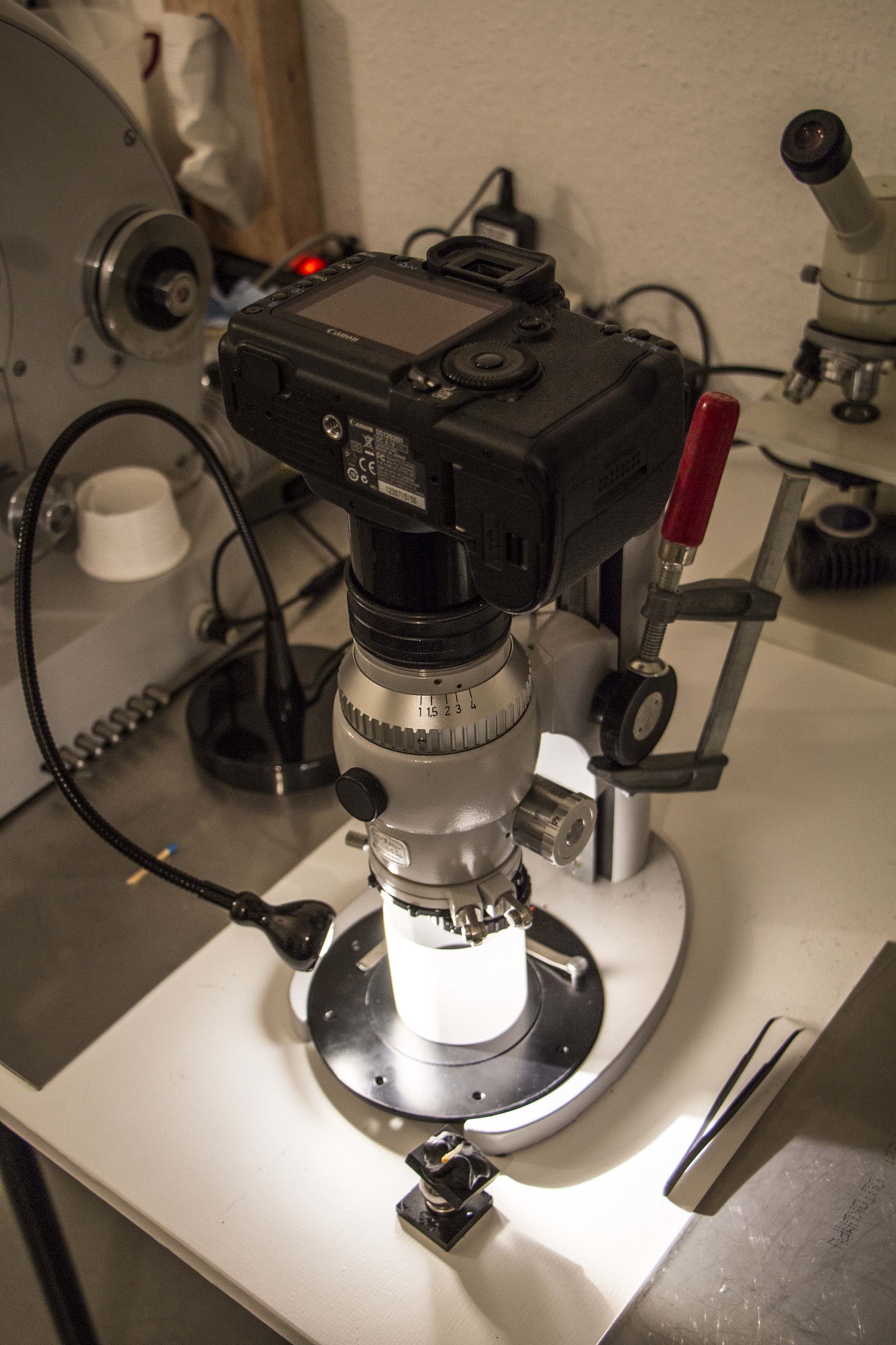 "Gestackt" wurde mit der kleinen Schraubzwinge. Bei stärkerer Vergrößerung läßt sich eine "Käferhöhe" mit etwa 135° Drehung bewältigen. Mit der Hand am Rad hat man kein Gefühl, ob man