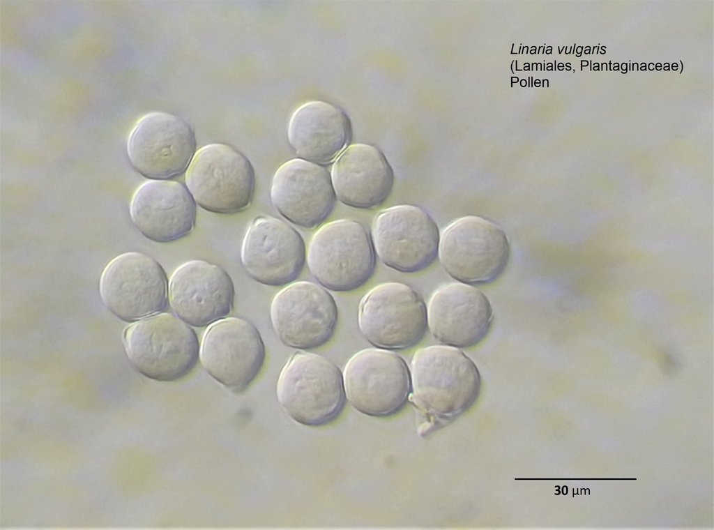 Mein erstes hier gezeigte Foto zeigt Pollen von Linaria vulgaris. Das Objekt ist ein Dauerpräparat, welches ich vor gut einer Woche hergestellt hatte. Ich habe die Pollen auf den OT aufgebracht, mit reinem Isopropanol beträufelt, und nach dem Abdampfen des Alkohols mit Euparal eingedeckt. Ich nehme an das Euparal ist noch nicht vollständig ausgehärtet.