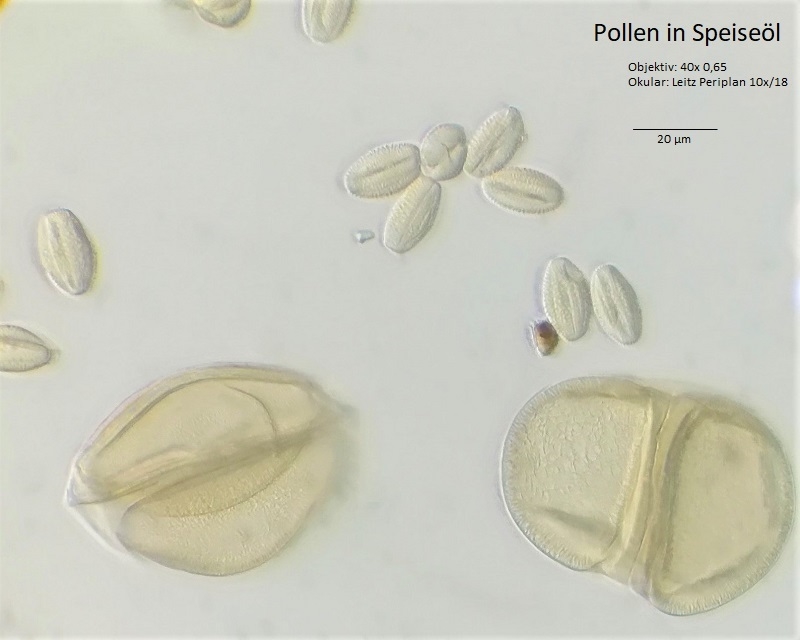 ich hab' den Pollen rechts unten mit dem Messokular nachgemessen. Dieser hat einen Durchmesser von gut 75µm. Dann habe ich - ganz unprofessionell - den Pollen auf dem Foto am Computerbildschirm abgemessen (70 mm), und dann umgerechnet wie lange der Messbalken sein muss damit ich ihn mit 20µm anschreiben kann.