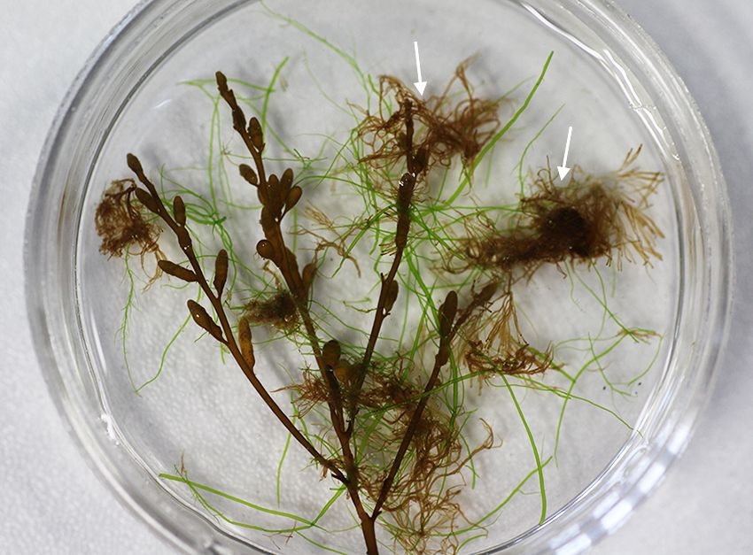 Im Spülsaum des Südstrands auf der Helgoländer Düne fand ich zahlreiche abgerundete Steine, auf denen einer dichter Bewuchs von Algen und größeren Tangen zu finden war. Dieser Bewuchs abgekratzt und in eine Glasschale überführt sah so aus: