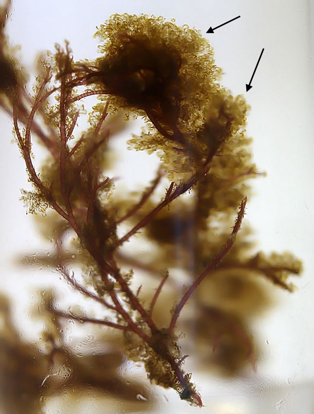 Manche der Algenthalli – hier die Rotalge Ceramium rubrum – sind üppig bewachsen mit wattigen Epiphytenbeständen (Pfeile), die praktisch ausschließlich aus Diatomeen bestehen. Ein wenig Material davon abgezupft bietet Material für ausgiebige Sessions am Mikroskop. Hier als Beispiel eine besonders hübsche Kolonie von Licmophora, vermutlich L. flabellina. Wie ein Blütenköpfchen sitzen die keilförmigen Zellen auf einem gemeinsamen Gallerstielchen; Verzweigungen der Kolonie treten ebenso auf wie unmittelbar an der Hauptachse sitzende Zellen: