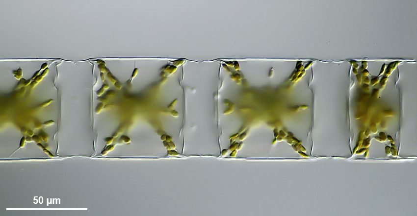 Und eine sternförmige, an die limnische Asterionella formosa erinnernde Kolonie von Thalassionema nitzschioides – deutlich zu sehen ist, wie die Zellen an ihrer Basis durch ein gemeinsames Gallertpolster aneinander haften: