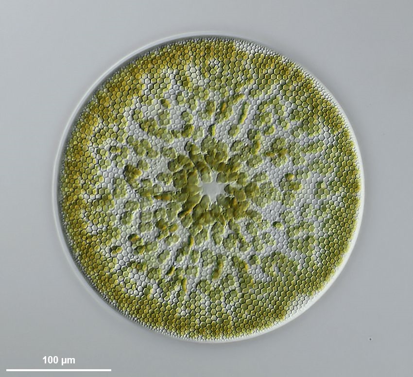 Immer wieder sehr beeindruckend die großen Coscinodiscus-Scheiben mit ihren hexagonalen Schalenskulpturen und den zahlreichen, linsenförmigen Chlorplasten unmittelbar unterhalb der Schale: