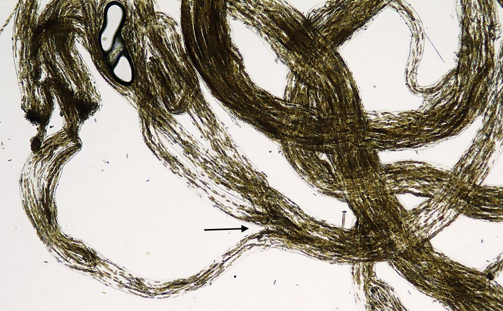 Bei schwacher Vergrößerung erhält man das folgende Bild - der Pfeil verweist auf eine Verzweigung im Gallertschlauch: