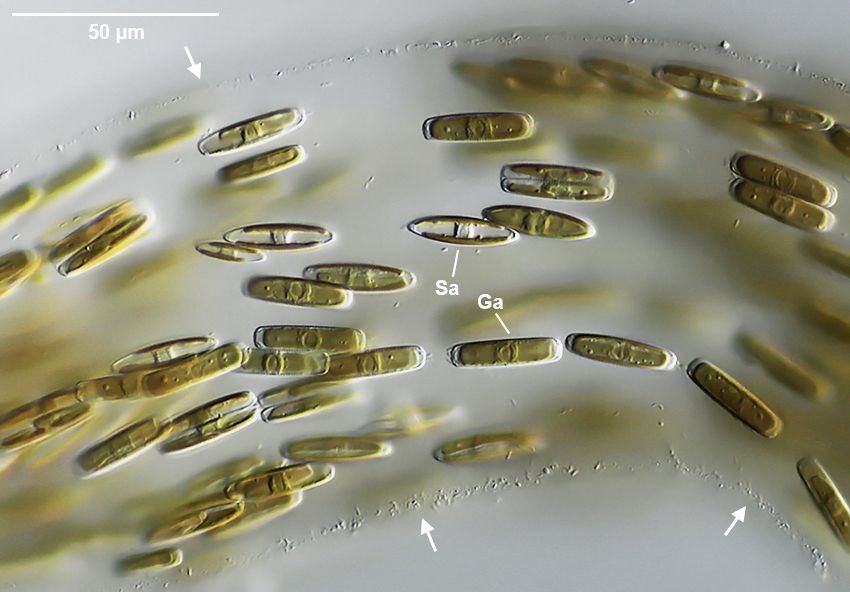 Die Begrenzungen der Gallertröhren sind durch Pfeilspitzen markiert; die Diatomeen zeigen dem Betrachter teils die Schalen- (Sa), teils die Gürtelbandansicht (Ga):