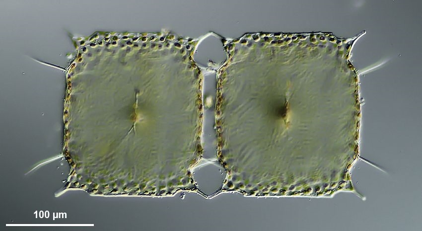 Zwei Arten der Gattung Odontella (vermutlich O. sinenis und regia), jeweils zwei Zellen, die über ihre auf der Schalenseite ansetzenden Fortsätze locker miteinander verbunden sind: