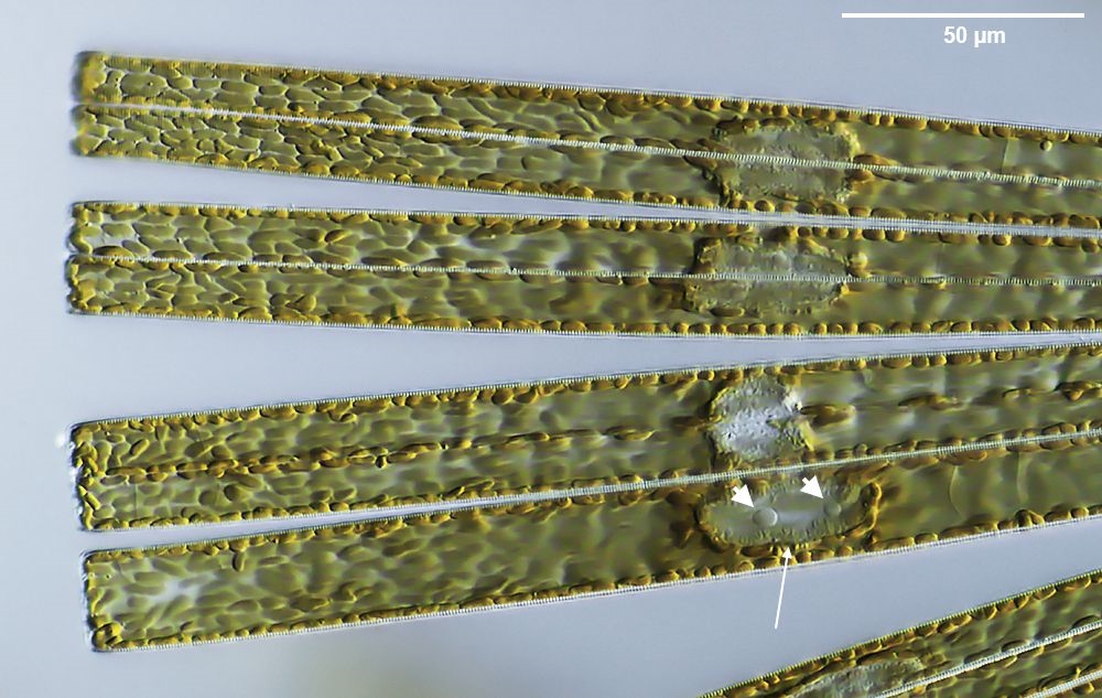 An lebenden Kieselalgen lassen sich Einzelheiten der zellulären Organisation erkennen, die die toten Schalenpräparate naturgemäß nicht mehr zeigen. Hierzu gehören die Kern- und Chloroplastenverhältnisse. Im folgenden Bild – vermutlich eine Synedra-Art – erkennt man bei allen Zellen die zahlreichen linsenförmigen Chloroplasten und den Kernbereich (dünner Pfeil, nur bei der untersten Zelle markiert) und innerhalb eines der Kerne rundliche Strukturen (Pfeilspitzen), die vermutlich Nukleoli darstellen: