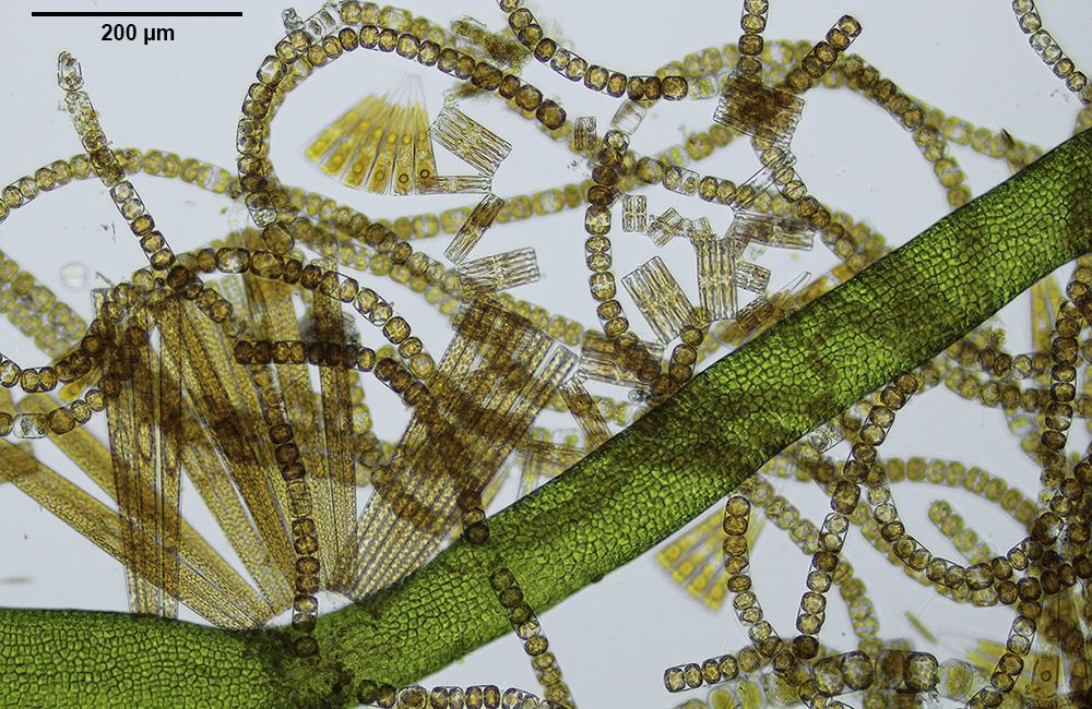 Neben schlauchförmigen grünen Algen aus der Enteromorpha-Verwandtschaft und einem großen Braunalgen-Tang sieht man ein zarteres Geflecht bräunlicher Fäden (Pfeilspitzen). Hierbei handelt es sich nicht etwa um fädige Braunalgen, sondern um Diatomeen, die in gallertigen Schläuchen leben und zu Tausenden einen kolonialen Verbund bilden. Vor einiger Zeit hatte ich im Forum schon mal einen ähnlichen Fall, allerdings bei Süßwasserdiatomeen aus dem Main, gezeigt: https://www.mikroskopie-forum.de/index.php?topic=28598.0