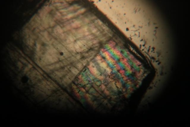 Bild 4 , bei ca 40° Kippwinkel zeigen sich im Bildbereich Mitte , unten ,rechts die ersten Chromocyklit-Farben . Das Anhydrit-Täfelchen hat in diesen Bereich eine andere Dicke als in den anderen Bereichen