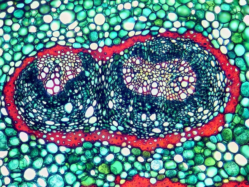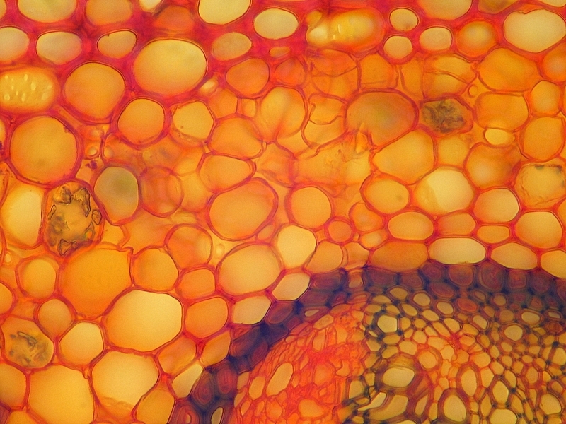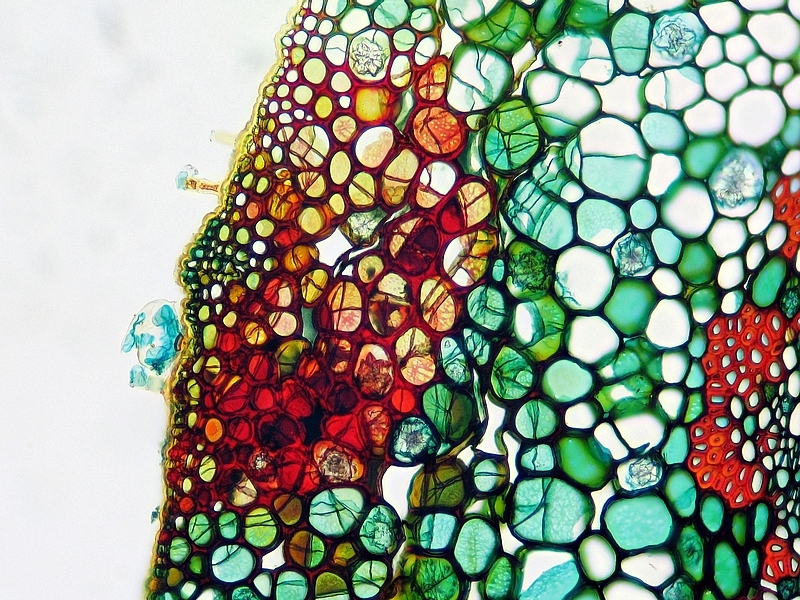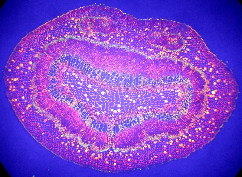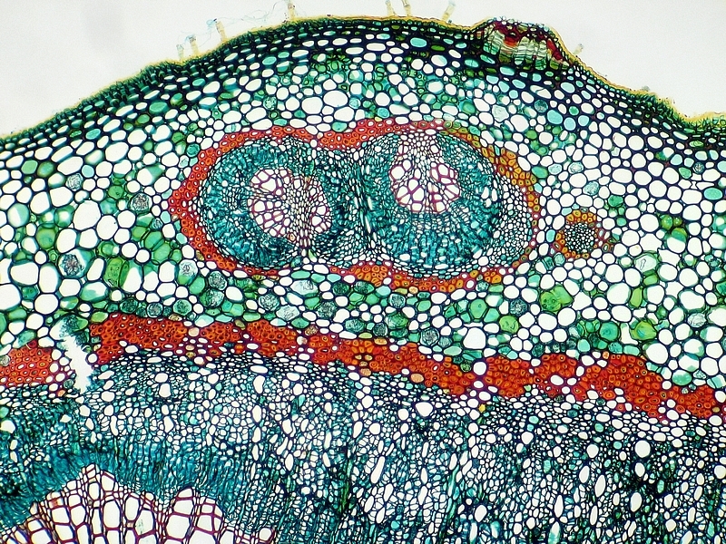 In Eckhards Beispielbild sind nur die Tracheen betroffen. Die fragileren Gewebe drumherum sind bestens erhalten. Bei meinem Schnitt hier ist es umgekehrt. Der beobachtete Schaden liegt - eng begrenzt - im Parenchym und die Leitbündel weisen keinerlei Verletzungen auf.