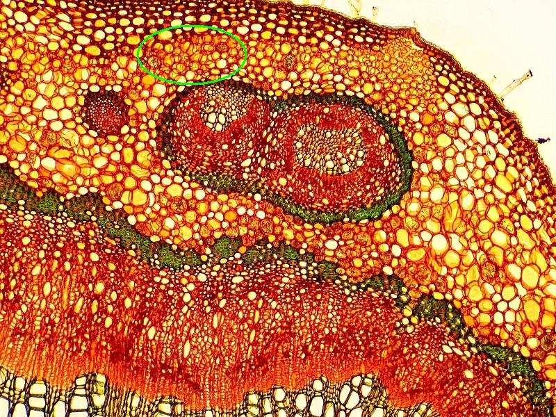 Außerhalb des Leitbündels auf etwa 5 Uhr sind (un)schön die Reste der verklumpten Zellinhalte in einigen Parenchymzellen zu sehen.