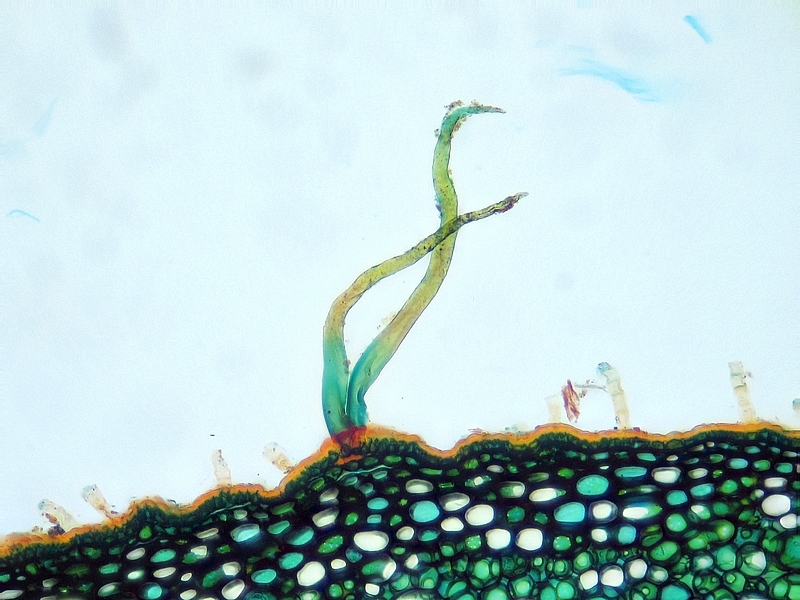 Bild 1: paarige Haare auf der Epidermis, Vergrößerung 100x, Stapel aus 19 Bildern